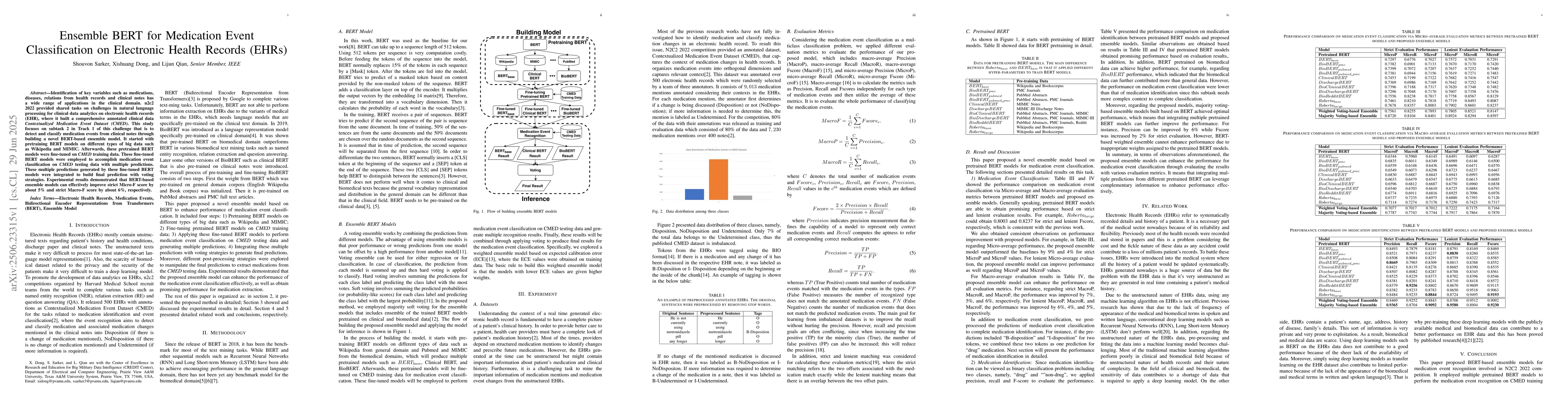 Identification of key variables such as medications, diseases, relations from health records and clinical notes has a wide range of applications in the clinical domain. n2c2 2022 provided shared tasks on challenges in natural language processing for clinical data analytics on electronic health records (EHR), where it built a comprehensive annotated clinical data Contextualized Medication Event Dataset (CMED). This study focuses on subtask 2 in Track 1 of this challenge that is to detect and classify medication events from clinical notes through building a novel BERT-based ensemble model. It started with pretraining BERT models on different types of big data such as Wikipedia and MIMIC. Afterwards, these pretrained BERT models were fine-tuned on CMED training data. These fine-tuned BERT models were employed to accomplish medication event classification on CMED testing data with multiple predictions. These multiple predictions generated by these fine-tuned BERT models were integrated to build final prediction with voting strategies. Experimental results demonstrated that BERT-based ensemble models can effectively improve strict Micro-F score by about 5% and strict Macro-F score by about 6%, respectively.