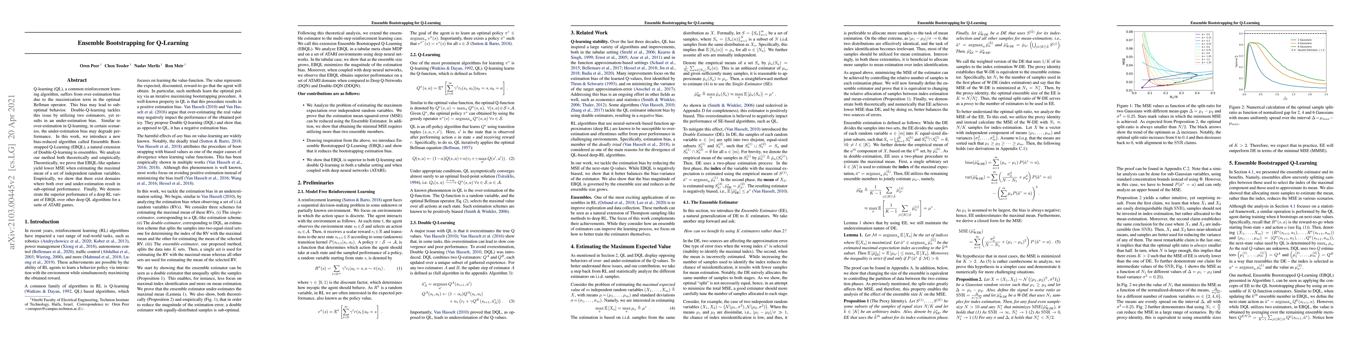 Q-learning (QL), a common reinforcement learning algorithm, suffers from over-estimation bias due to the maximization term in the optimal Bellman operator. This bias may lead to sub-optimal behavior. Double-Q-learning tackles this issue by utilizing two estimators, yet results in an under-estimation bias. Similar to over-estimation in Q-learning, in certain scenarios, the under-estimation bias may degrade performance. In this work, we introduce a new bias-reduced algorithm called Ensemble Bootstrapped Q-Learning (EBQL), a natural extension of Double-Q-learning to ensembles. We analyze our method both theoretically and empirically. Theoretically, we prove that EBQL-like updates yield lower MSE when estimating the maximal mean of a set of independent random variables. Empirically, we show that there exist domains where both over and under-estimation result in sub-optimal performance. Finally, We demonstrate the superior performance of a deep RL variant of EBQL over other deep QL algorithms for a suite of ATARI games.