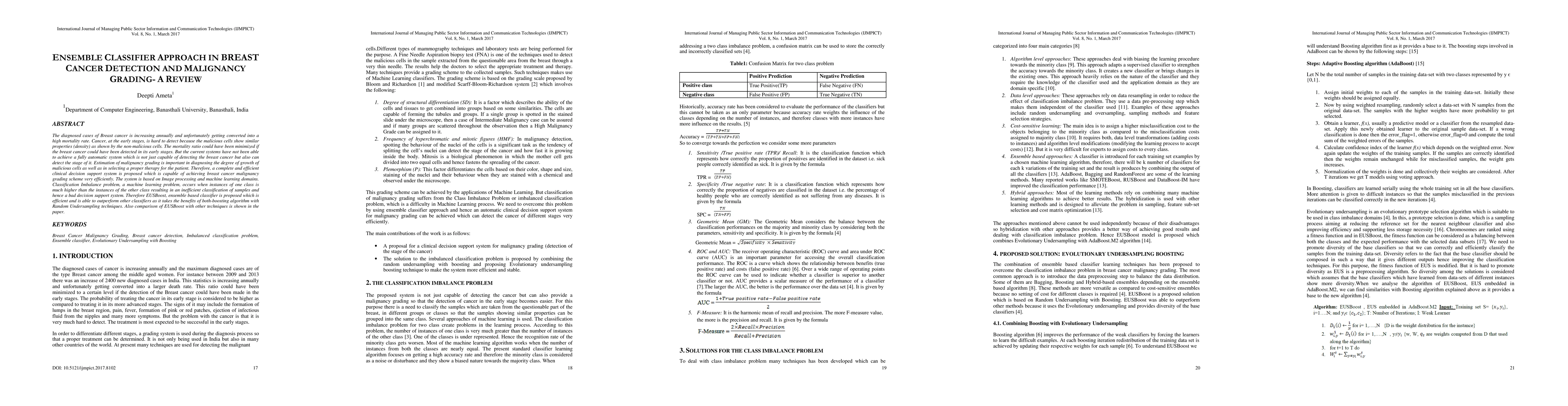 The diagnosed cases of Breast cancer is increasing annually and unfortunately getting converted into a high mortality rate. Cancer, at the early stages, is hard to detect because the malicious cells show similar properties (density) as shown by the non-malicious cells. The mortality ratio could have been minimized if the breast cancer could have been detected in its early stages. But the current systems have not been able to achieve a fully automatic system which is not just capable of detecting the breast cancer but also can detect the stage of it. Estimation of malignancy grading is important in diagnosing the degree of growth of malicious cells as well as in selecting a proper therapy for the patient. Therefore, a complete and efficient clinical decision support system is proposed which is capable of achieving breast cancer malignancy grading scheme very efficiently. The system is based on Image processing and machine learning domains. Classification Imbalance problem, a machine learning problem, occurs when instances of one class is much higher than the instances of the other class resulting in an inefficient classification of samples and hence a bad decision support system. Therefore EUSBoost, ensemble based classifier is proposed which is efficient and is able to outperform other classifiers as it takes the benefits of both-boosting algorithm with Random Undersampling techniques. Also comparison of EUSBoost with other techniques is shown in the paper.