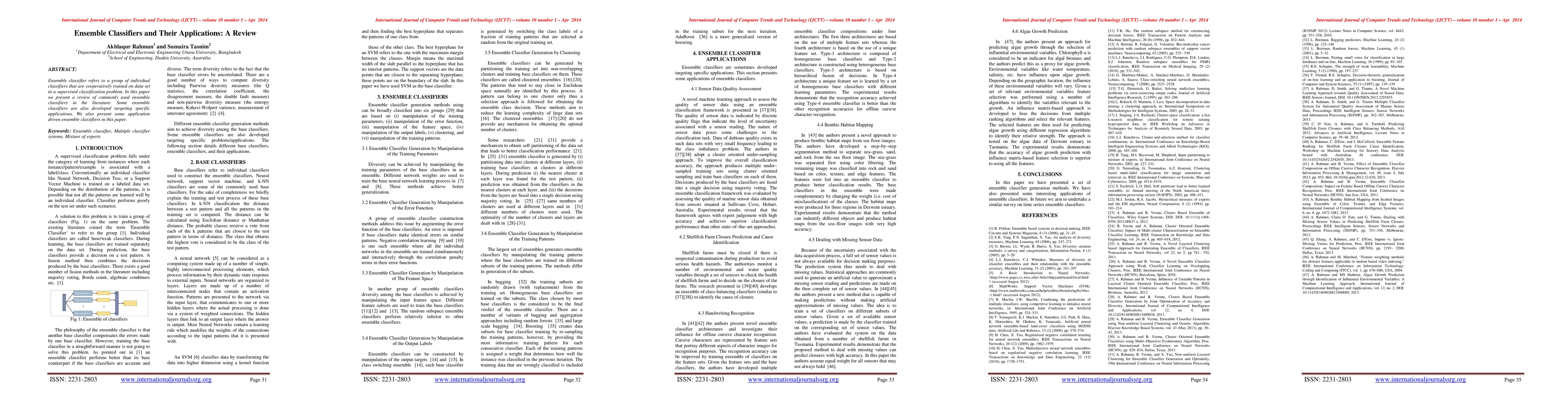 This paper reviews commonly used ensemble classifiers, which combine multiple individual classifiers to improve classification performance, and highlights specific application-driven ensemble classifiers developed for particular tasks.
