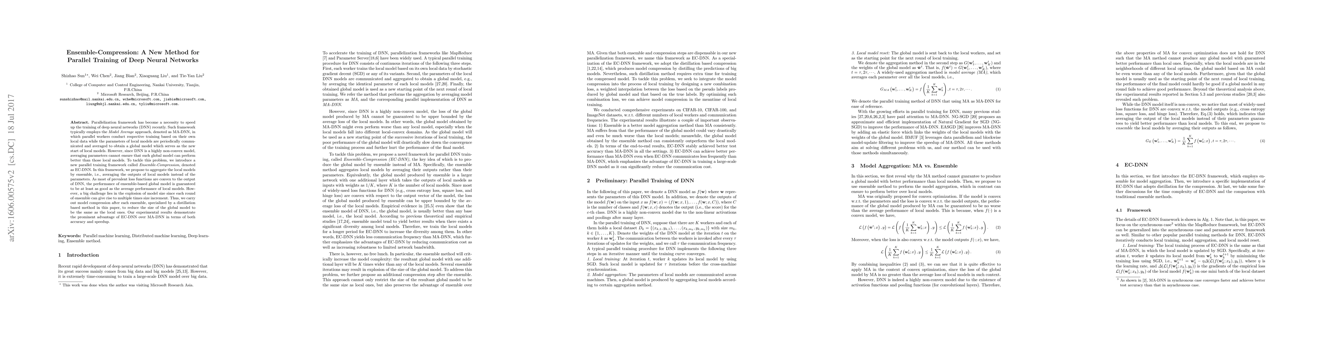 Parallelization framework has become a necessity to speed up the training of deep neural networks (DNN) recently. Such framework typically employs the Model Average approach, denoted as MA-DNN, in which parallel workers conduct respective training based on their own local data while the parameters of local models are periodically communicated and averaged to obtain a global model which serves as the new start of local models. However, since DNN is a highly non-convex model, averaging parameters cannot ensure that such global model can perform better than those local models. To tackle this problem, we introduce a new parallel training framework called Ensemble-Compression, denoted as EC-DNN. In this framework, we propose to aggregate the local models by ensemble, i.e., averaging the outputs of local models instead of the parameters. As most of prevalent loss functions are convex to the output of DNN, the performance of ensemble-based global model is guaranteed to be at least as good as the average performance of local models. However, a big challenge lies in the explosion of model size since each round of ensemble can give rise to multiple times size increment. Thus, we carry out model compression after each ensemble, specialized by a distillation based method in this paper, to reduce the size of the global model to be the same as the local ones. Our experimental results demonstrate the prominent advantage of EC-DNN over MA-DNN in terms of both accuracy and speedup.