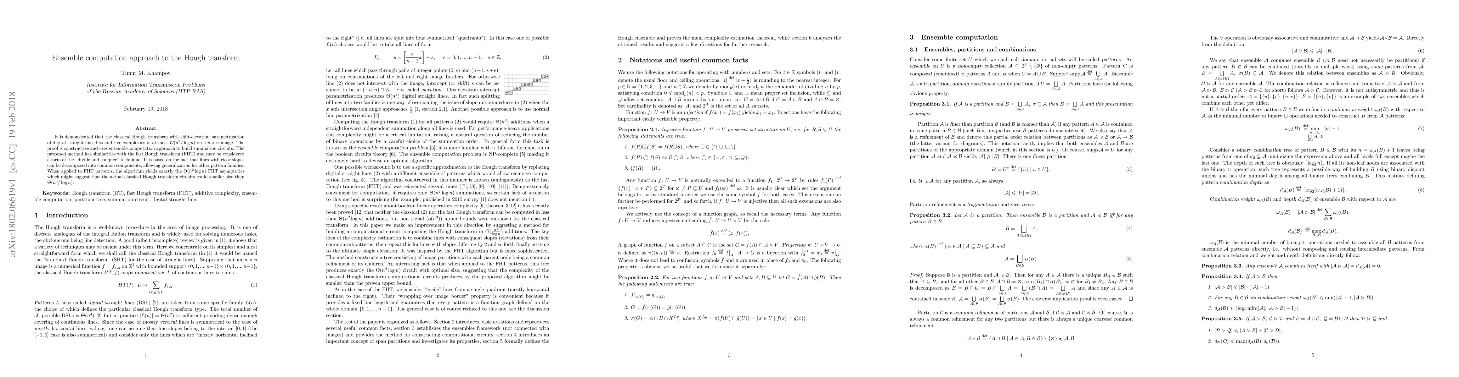 This paper proposes an ensemble computation approach to improve the complexity of the classical Hough transform for digital straight lines, achieving an upper bound of $\mathcal{O}(n^3 / \log n)$ on a $n\times n$ image. The method leverages "divide and conquer" principles and may generalize to other pattern families.