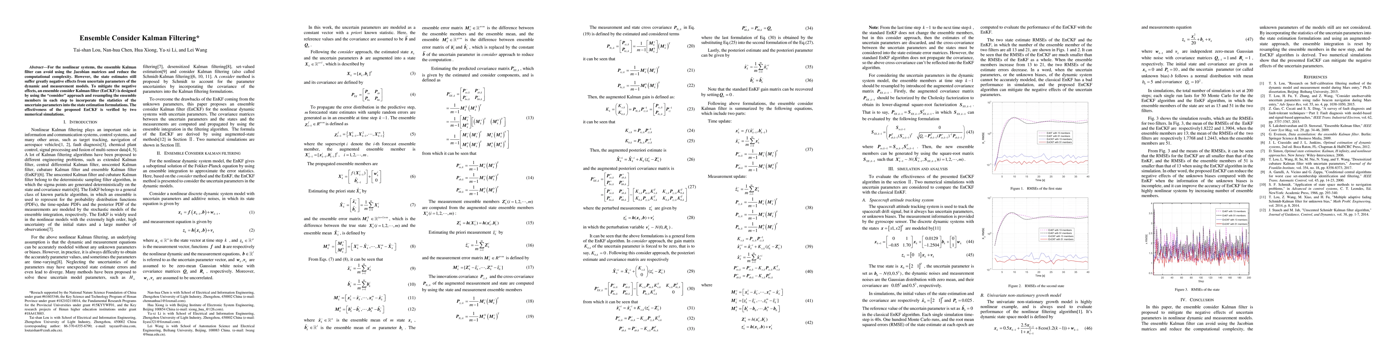 The paper proposes an ensemble consider Kalman filter (EnCKF) to address uncertainties in nonlinear models, reducing computational complexity without Jacobian matrices. The EnCKF incorporates uncertain parameter statistics into state estimation, resetting the ensemble through resampling, and demonstrates improved performance in numerical simulations.