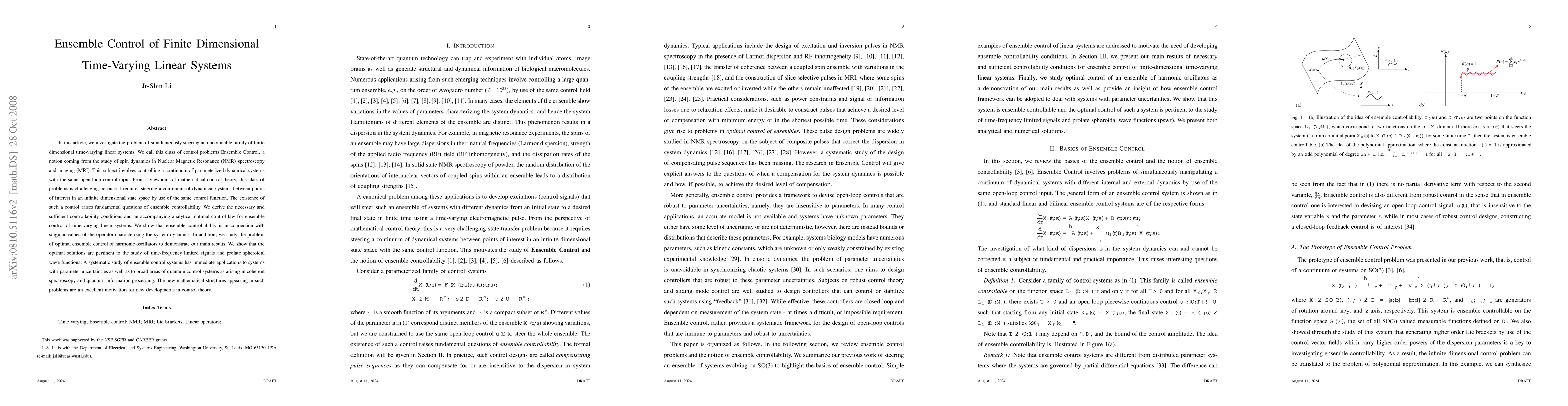 This paper explores the concept of Ensemble Control for finite dimensional time-varying linear systems, deriving necessary and sufficient controllability conditions and an optimal control law. The study connects ensemble controllability to singular values of system dynamics and has implications for quantum control systems and parameter uncertainty management.