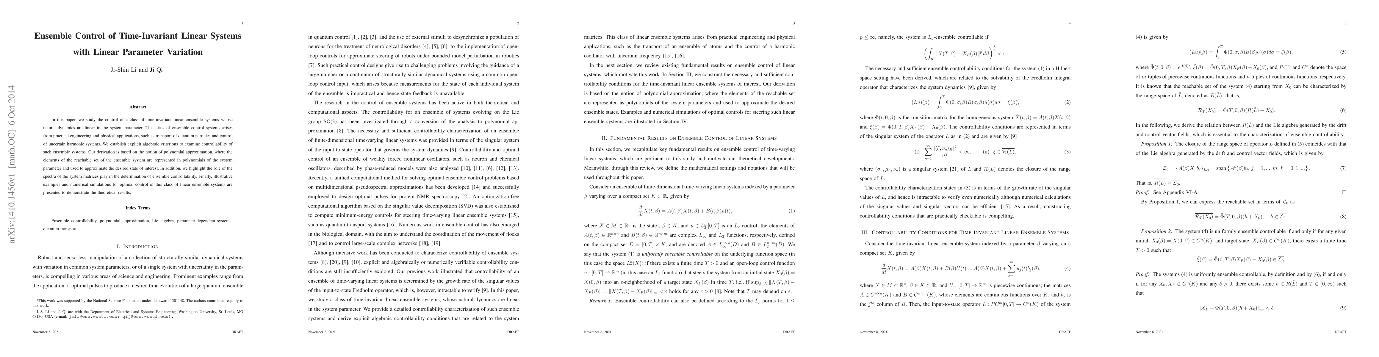 This paper develops algebraic criteria for controlling time-invariant linear ensemble systems with linear parameter variation, utilizing polynomial approximations to determine controllability and the influence of system matrix spectra. Practical applications in quantum transport and harmonic systems are considered, with illustrative examples and simulations.
