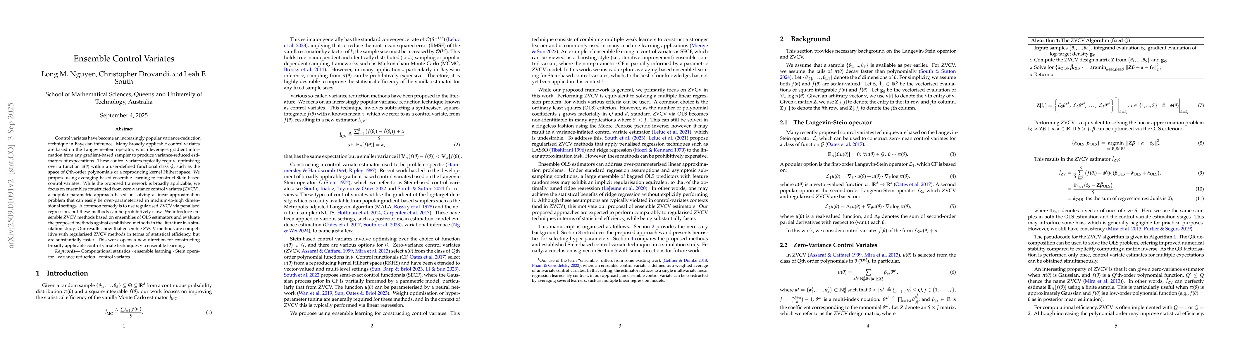 Control variates have become an increasingly popular variance-reduction technique in Bayesian inference. Many broadly applicable control variates are based on the Langevin-Stein operator, which leverages gradient information from any gradient-based sampler to produce variance-reduced estimators of expectations. These control variates typically require optimising over a function $u(\theta)$ within a user-defined functional class $G$, such as the space of $Q$th-order polynomials or a reproducing kernel Hilbert space. We propose using averaging-based ensemble learning to construct Stein-based control variates. While the proposed framework is broadly applicable, we focus on ensembles constructed from zero-variance control variates (ZVCV), a popular parametric approach based on solving a linear approximation problem that can easily be over-parameterised in medium-to-high dimensional settings. A common remedy is to use regularised ZVCV via penalised regression, but these methods can be prohibitively slow. We introduce ensemble ZVCV methods based on ensembles of OLS estimators and evaluate the proposed methods against established methods in the literature in a simulation study. Our results show that ensemble ZVCV methods are competitive with regularised ZVCV methods in terms of statistical efficiency, but are substantially faster. This work opens a new direction for constructing broadly applicable control variate techniques via ensemble learning.