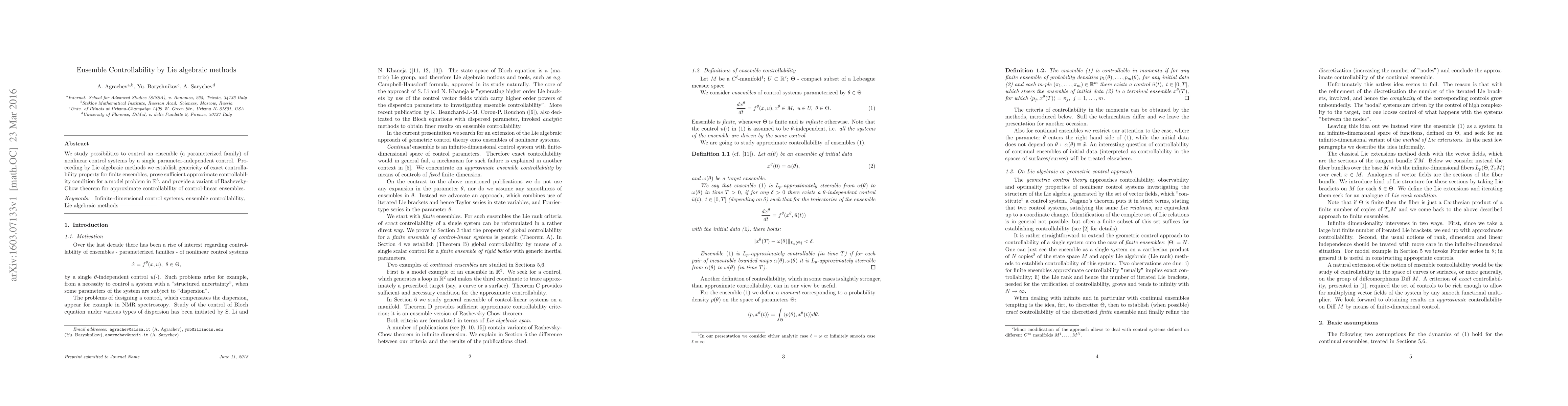 This paper explores the controllability of ensembles of nonlinear systems using Lie algebraic methods, establishing the generic exact controllability for finite ensembles and proving sufficient conditions for approximate controllability in $\mathbb{R}^3$. It also extends the Rashevsky-Chow theorem for approximate controllability in control-linear systems.