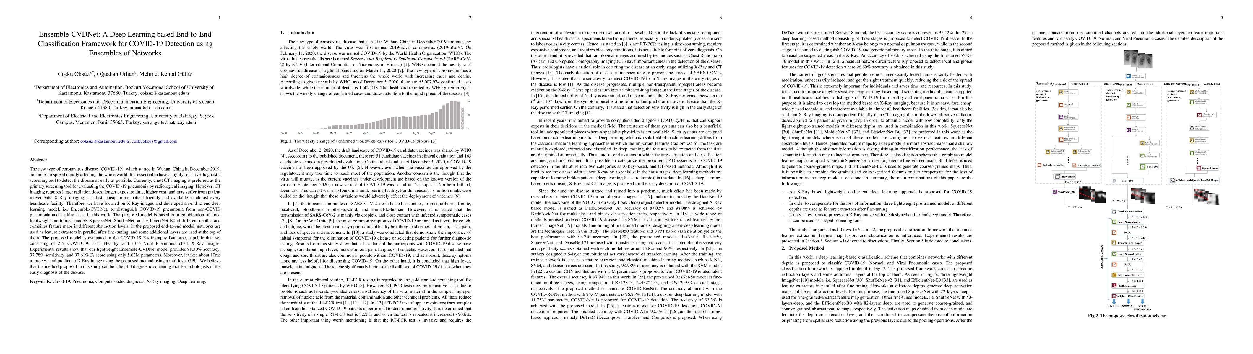 The new type of coronavirus disease (COVID-19), which started in Wuhan, China in December 2019, continues to spread rapidly affecting the whole world. It is essential to have a highly sensitive diagnostic screening tool to detect the disease as early as possible. Currently, chest CT imaging is preferred as the primary screening tool for evaluating the COVID-19 pneumonia by radiological imaging. However, CT imaging requires larger radiation doses, longer exposure time, higher cost, and may suffer from patient movements. X-Ray imaging is a fast, cheap, more patient-friendly and available in almost every healthcare facility. Therefore, we have focused on X-Ray images and developed an end-to-end deep learning model, i.e. Ensemble-CVDNet, to distinguish COVID-19 pneumonia from non-COVID pneumonia and healthy cases in this work. The proposed model is based on a combination of three lightweight pre-trained models SqueezeNet, ShuffleNet, and EfficientNet-B0 at different depths, and combines feature maps in different abstraction levels. In the proposed end to-end model, networks are used as feature extractors in parallel after fine-tuning, and some additional layers are used at the top of them. The proposed model is evaluated in the COVID-19 Radiography Database, a public data set consisting of 219 COVID-19, 1341 Healthy, and 1345 Viral Pneumonia chest X-Ray images. Experimental results show that our lightweight Ensemble-CVDNet model provides 98.30% accuracy, 97.78% sensitivity, and 97.61% F1 score using only 5.62M parameters. Moreover, it takes about 10ms to process and predict an X-Ray image using the proposed method using a mid level GPU. We believe that the method proposed in this study can be a helpful diagnostic screening tool for radiologists in the early diagnosis of the disease.
