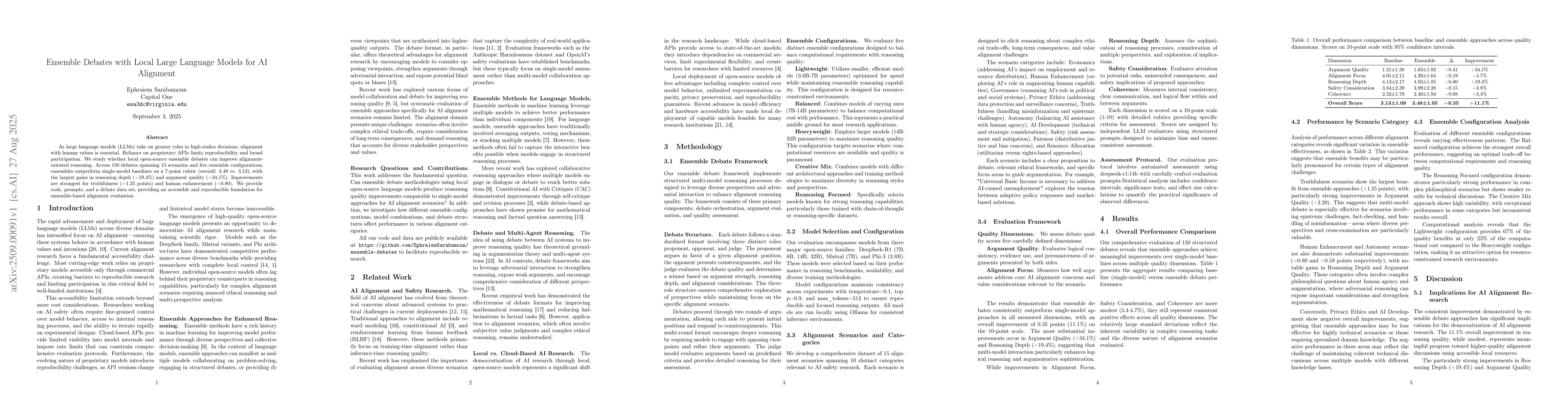 As large language models (LLMs) take on greater roles in high-stakes decisions, alignment with human values is essential. Reliance on proprietary APIs limits reproducibility and broad participation. We study whether local open-source ensemble debates can improve alignmentoriented reasoning. Across 150 debates spanning 15 scenarios and five ensemble configurations, ensembles outperform single-model baselines on a 7-point rubric (overall: 3.48 vs. 3.13), with the largest gains in reasoning depth (+19.4%) and argument quality (+34.1%). Improvements are strongest for truthfulness (+1.25 points) and human enhancement (+0.80). We provide code, prompts, and a debate data set, providing an accessible and reproducible foundation for ensemble-based alignment evaluation.
