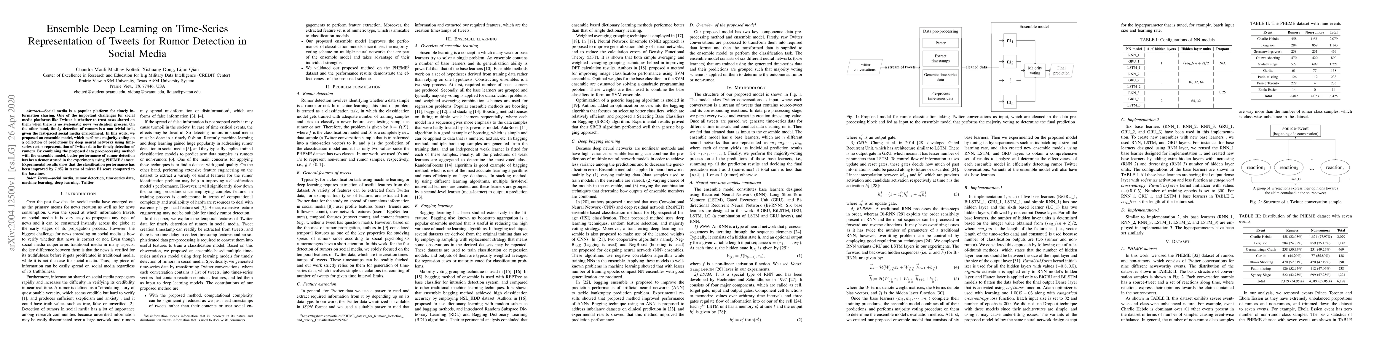 This paper proposes an ensemble deep learning model that uses time-series vector representations of tweets to detect rumors on social media. The ensemble model, which combines predictions from multiple deep neural networks, achieves a 7.9% improvement in micro F1 score over baselines for rumor detection on the PHEME dataset.