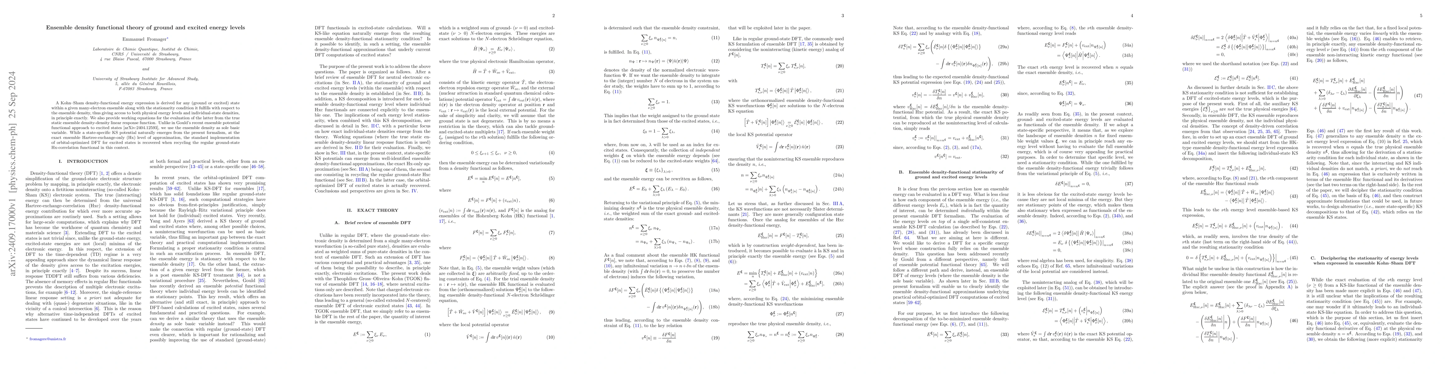 A Kohn-Sham density-functional energy expression is derived for any (ground or excited) state within a given many-electron ensemble along with the stationarity condition it fulfills with respect to the ensemble density, thus giving access to both physical energy levels and individual-state densities, in principle exactly. We also provide working equations for the evaluation of the latter from the true static ensemble density-density linear response function. Unlike in Gould's recent ensemble potential functional approach to excited states [arXiv:2404.12593], we use the ensemble density as sole basic variable. While a state-specific KS potential naturally emerges from the present formalism, at the exact ensemble Hartree-exchange-only (Hx) level of approximation, the standard implementation of orbital-optimized DFT for excited states is recovered when recycling the regular ground-state Hx-correlation functional in this context.