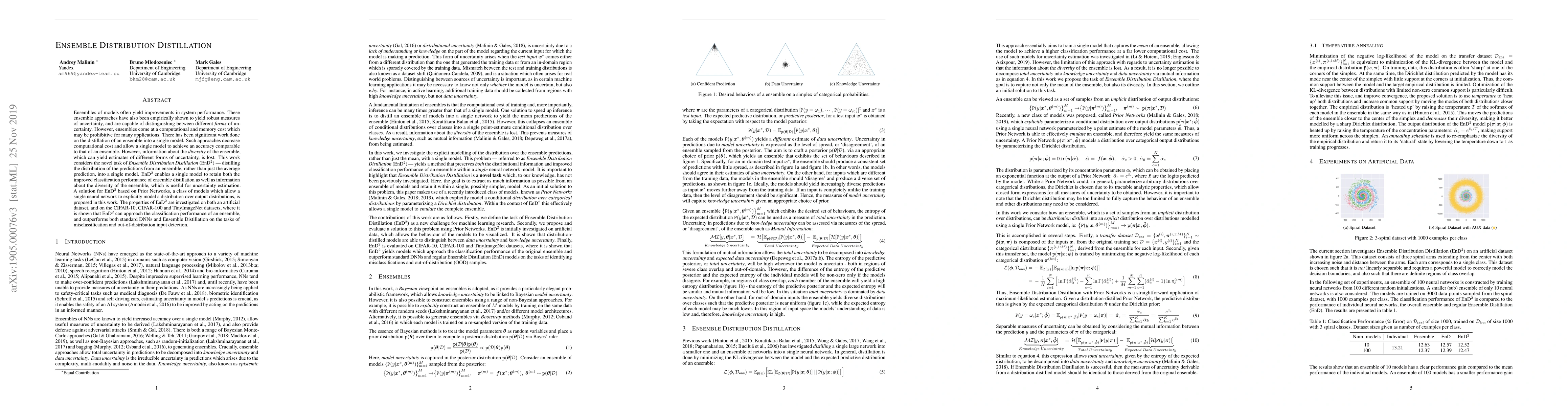 Ensemble Distribution Distillation (EnD$^2$) aims to distill the distribution of ensemble predictions into a single model, retaining both improved classification performance and uncertainty information. This is achieved using Prior Networks, which model a distribution over output distributions, and is shown to outperform standard models on misclassification and out-of-distribution detection tasks.