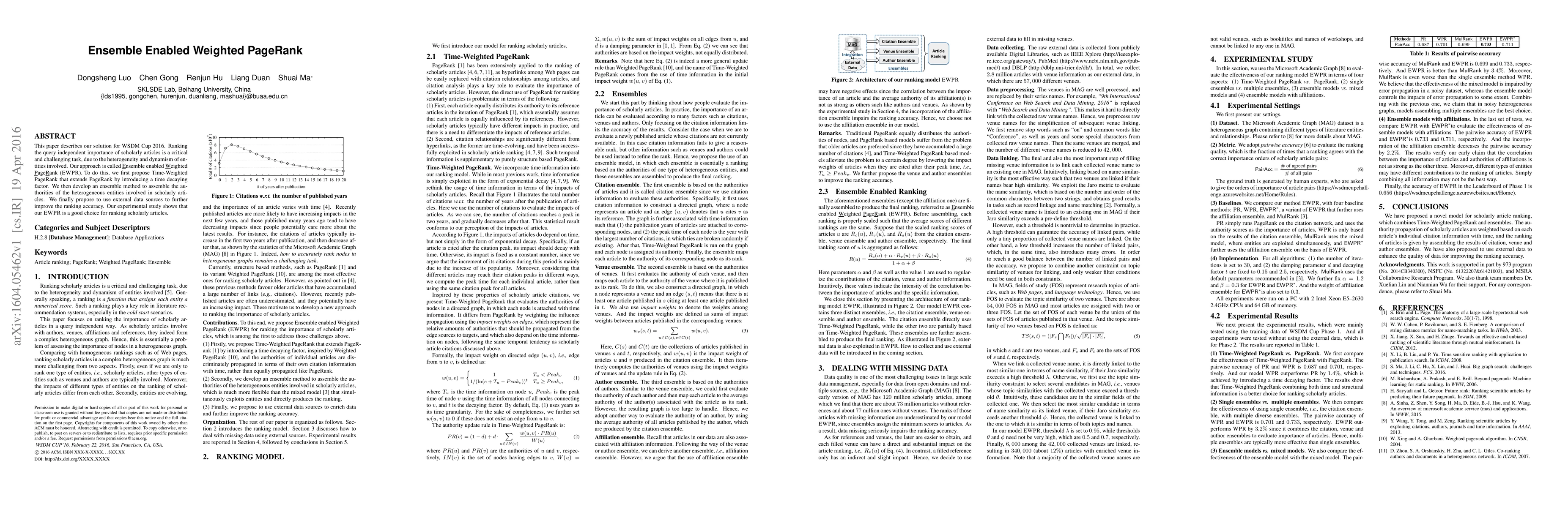 This paper describes our solution for WSDM Cup 2016. Ranking the query independent importance of scholarly articles is a critical and challenging task, due to the heterogeneity and dynamism of entities involved. Our approach is called Ensemble enabled Weighted PageRank (EWPR). To do this, we first propose Time-Weighted PageRank that extends PageRank by introducing a time decaying factor. We then develop an ensemble method to assemble the authorities of the heterogeneous entities involved in scholarly articles. We finally propose to use external data sources to further improve the ranking accuracy. Our experimental study shows that our EWPR is a good choice for ranking scholarly articles.