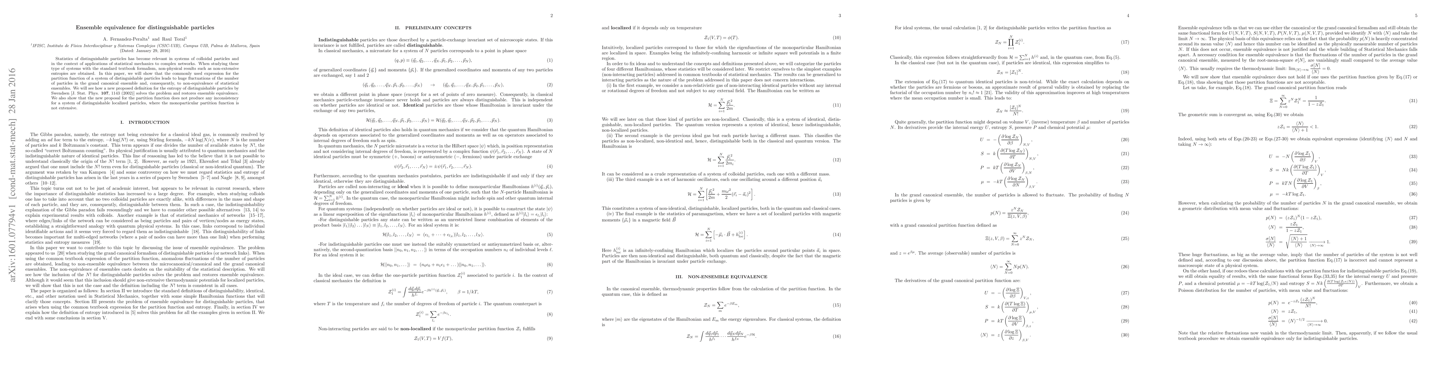 The paper presents a revised partition function for distinguishable particles that ensures ensemble equivalence and extensive thermodynamic potentials, resolving issues with large fluctuations in the grand canonical ensemble.