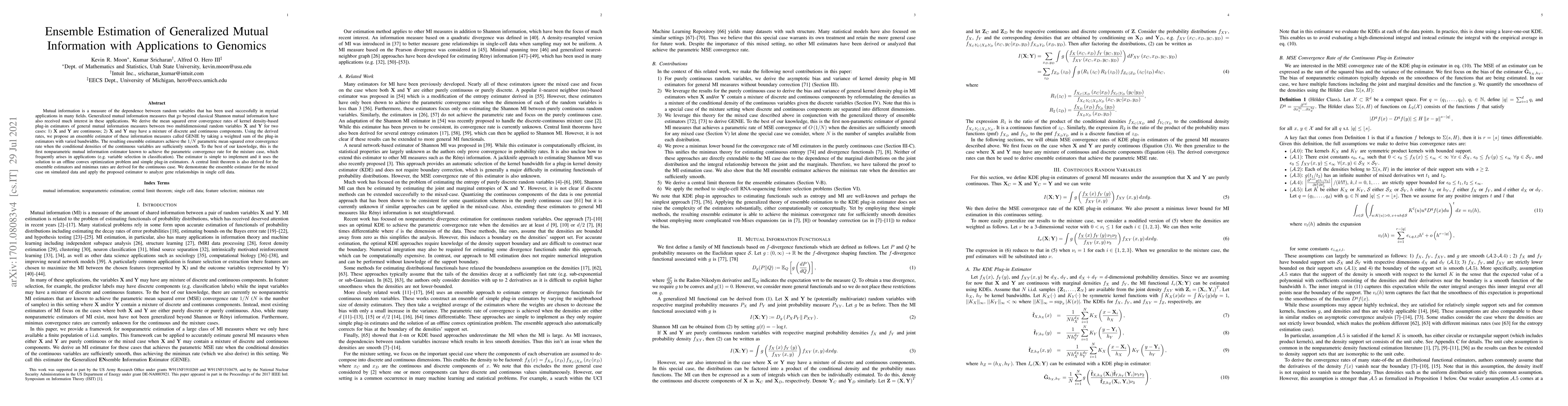 This paper proposes an ensemble estimator, GENIE, for generalized mutual information measures between multidimensional random variables, achieving $1/N$ convergence rate. The estimator is shown to outperform traditional plug-in estimators and is applied to analyze gene relationships in single cell genomics data.