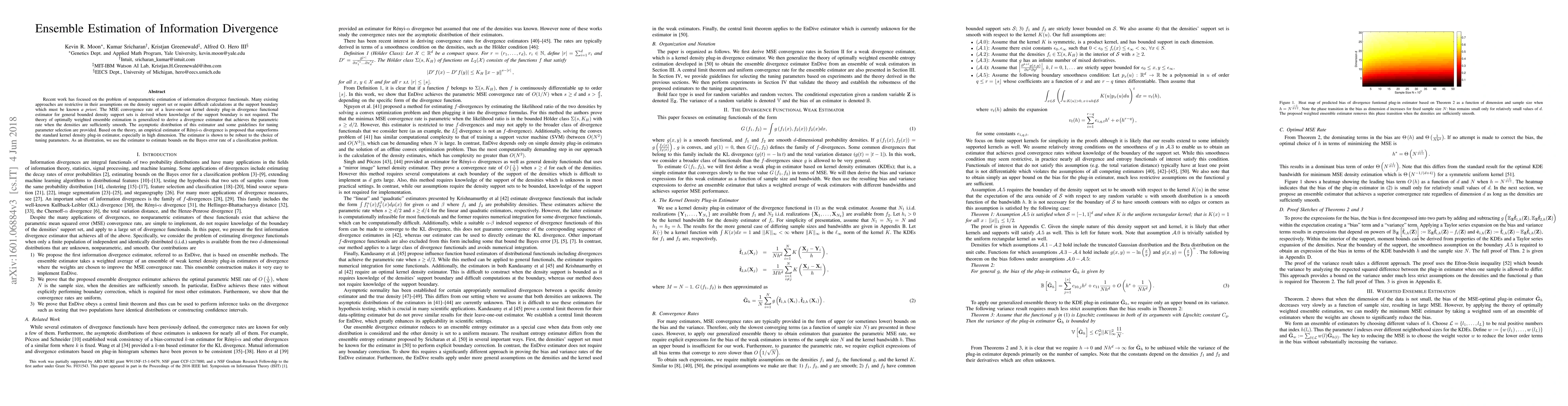 This paper proposes an ensemble estimation method for information divergence functionals that achieves parametric convergence rates without requiring prior knowledge of the density support boundary. The new estimator, based on optimally weighted ensemble techniques, outperforms traditional kernel density plug-in methods, especially in high dimensions, and is demonstrated through its application in estimating bounds on the Bayes error rate for classification problems.
