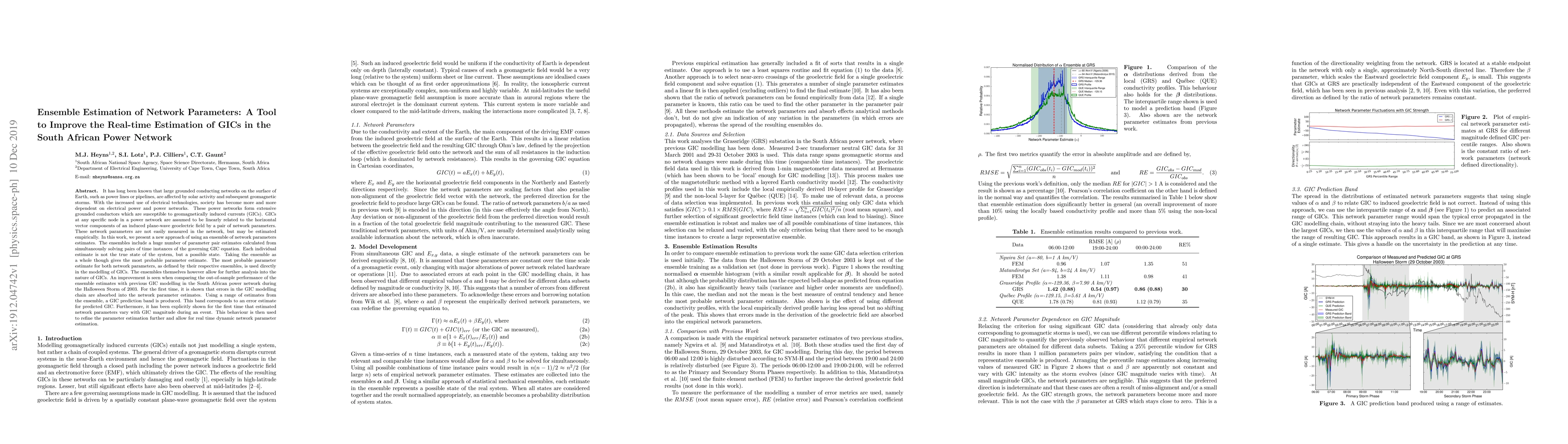 It has long been known that large grounded conducting networks on the surface of Earth are affected by solar activity and geomagnetic storms. Power networks are such extensive grounded conductors and are susceptible to geomagnetically induced currents (GICs). GICs at any specific node in a power network are assumed to be linearly related to the horizontal vector components of an induced plane-wave geoelectric field by a pair of network parameters. These network parameters are not easily measured in the network, but may be estimated empirically. In this work, we present a new approach of using an ensemble of network parameters estimates. The ensembles include a huge number of parameter pair estimates calculated from simultaneously solving pairs of time instances of the governing GIC equation. Each individual estimate is not the true state of the system, but a possible state. Taking the ensemble as a whole though gives the most probable parameter estimate. The most probable parameter estimate for both network parameters, as defined by their respective ensembles, is used directly in the modelling of GICs. The ensembles themselves however allow for further analysis into the nature of GICs. An improvement is seen when comparing the out-of-sample performance of the ensemble estimates with previous GIC modelling in the South African power network during the Halloween Storm of 2003. For the first time, it is shown that errors in the GIC modelling chain are absorbed into the network parameter estimates. Using a range of estimates from the ensemble, a GIC prediction band is produced. This band corresponds to an error estimate for predicted GIC. Furthermore, it has been explicitly shown that estimated network parameters vary with GIC magnitude during an event. This behaviour is then used to refine the parameter estimation further and allow for real time dynamic network parameter estimation.