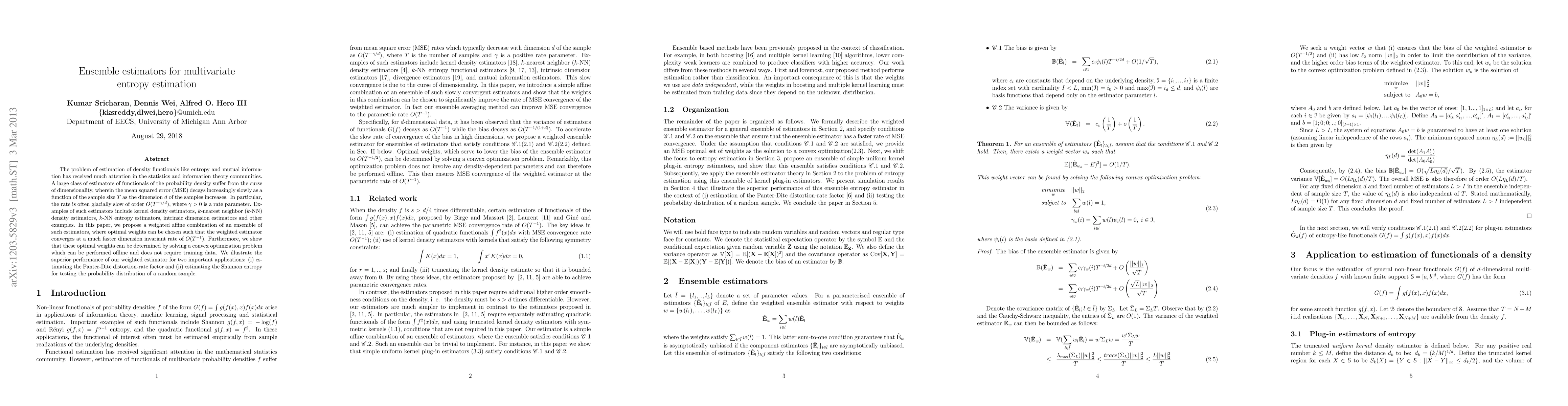 This paper proposes an ensemble estimator for multivariate entropy and mutual information that combines multiple density estimators with optimal weights to achieve a faster convergence rate of $O(T^{-1})$, significantly improving upon the traditional $O(T^{-{\gamma}/{d}})$ rate. The optimal weights are determined via a convex optimization problem, enhancing performance in applications like distortion-rate factor estimation and Shannon entropy testing.