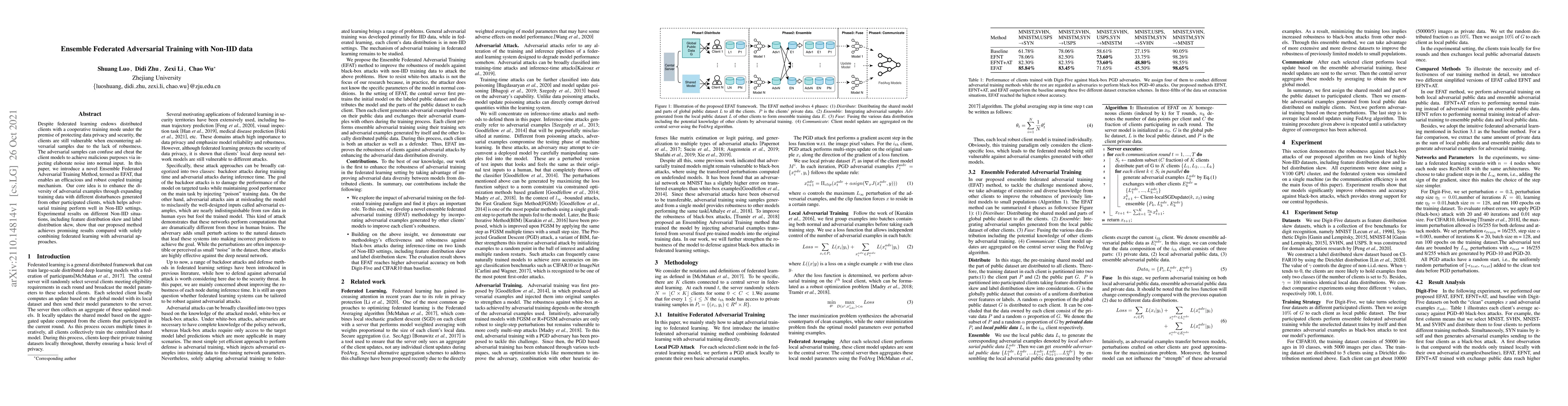 This paper proposes Ensemble Federated Adversarial Training (EFAT) to enhance the robustness of federated learning against adversarial samples. EFAT improves the diversity of adversarial examples by incorporating disturbances from other clients, achieving better performance in Non-IID settings and demonstrating promising results in various experimental scenarios.