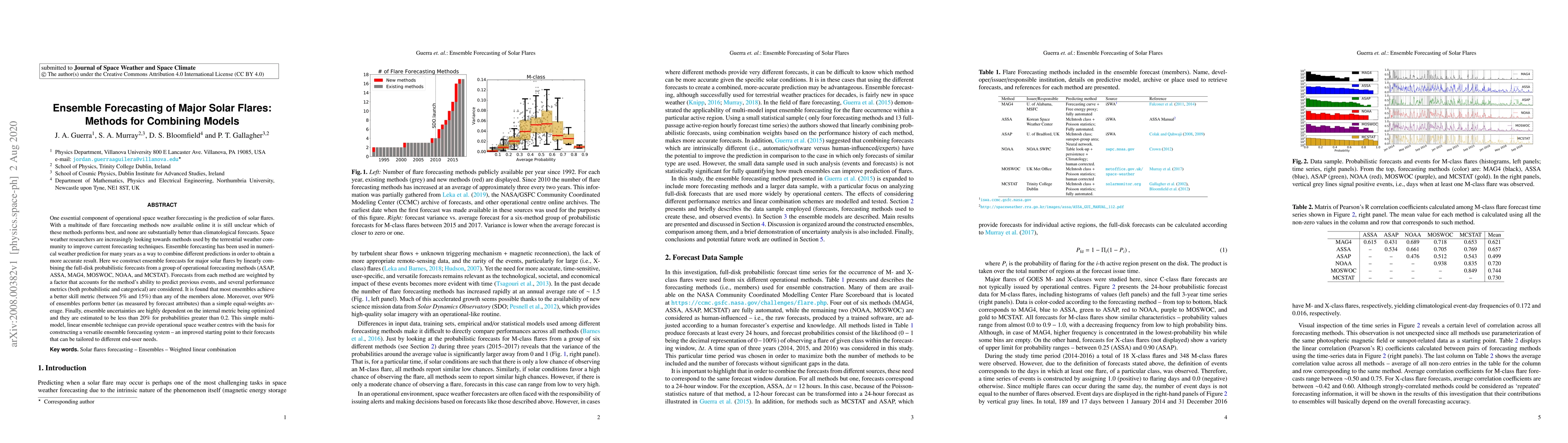 This paper develops an ensemble forecasting method for predicting major solar flares by combining probabilistic forecasts from various operational models, finding that ensembles outperform individual models by 5%-15% in skill metrics. The study shows that over 90% of ensembles perform better than an equal-weighted average, suggesting a potential improvement for operational space weather forecasting.