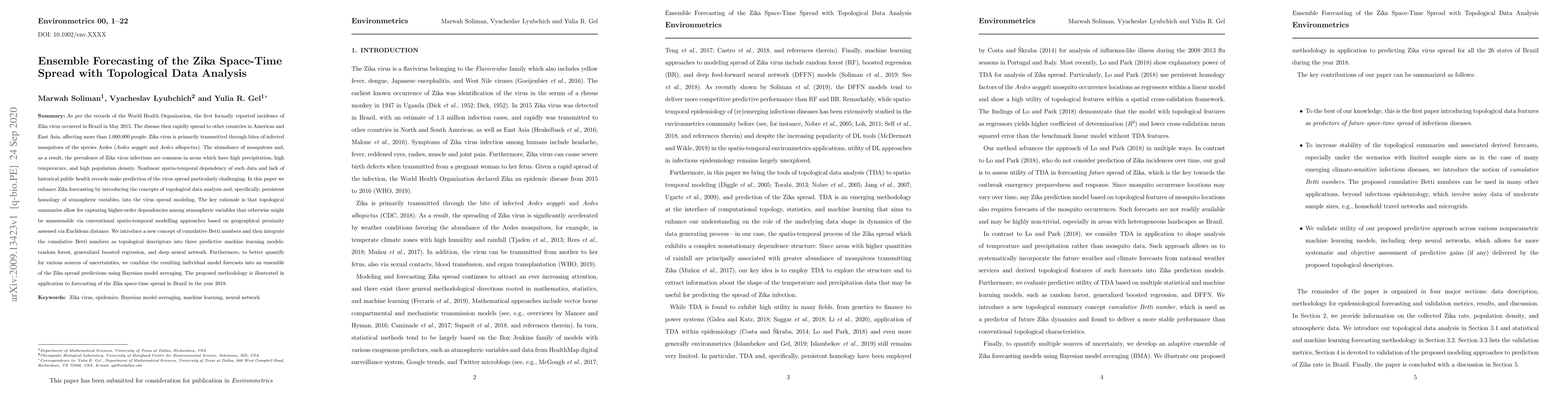 This paper proposes an ensemble forecasting method for Zika virus spread using topological data analysis to capture complex atmospheric dependencies, integrating persistent homology into machine learning models, and employing Bayesian model averaging to combine predictions for improved accuracy. The approach is demonstrated through forecasting Zika spread in Brazil in 2018.
