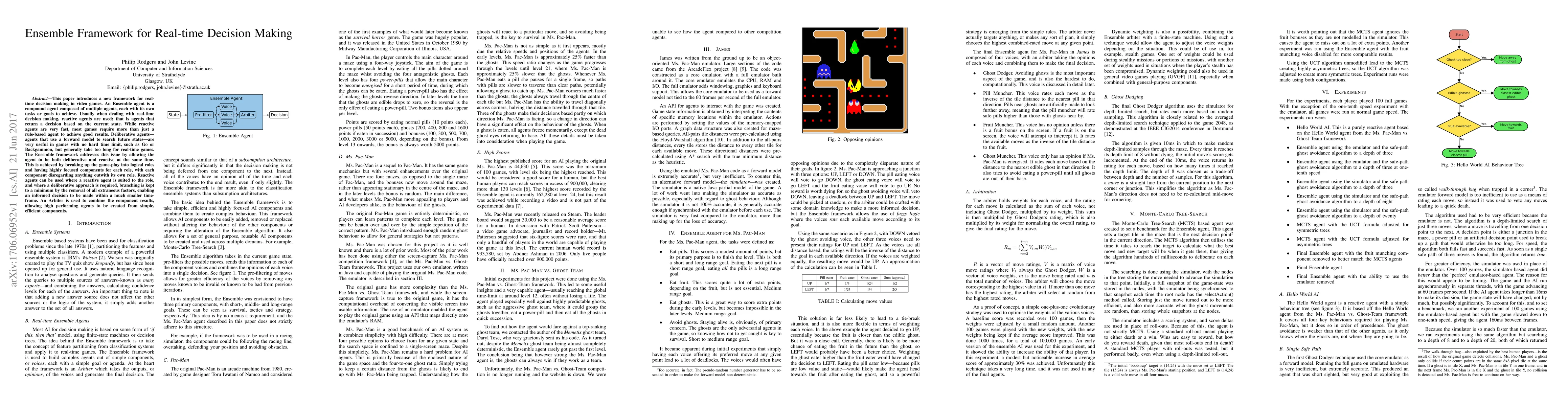 A new framework allows agents in real-time video games to balance deliberative and reactive decision-making, enabling faster gameplay while still achieving good results. By breaking down game roles into focused components and using an arbiter to combine their results, the Ensemble framework creates high-performing agents from simpler components.