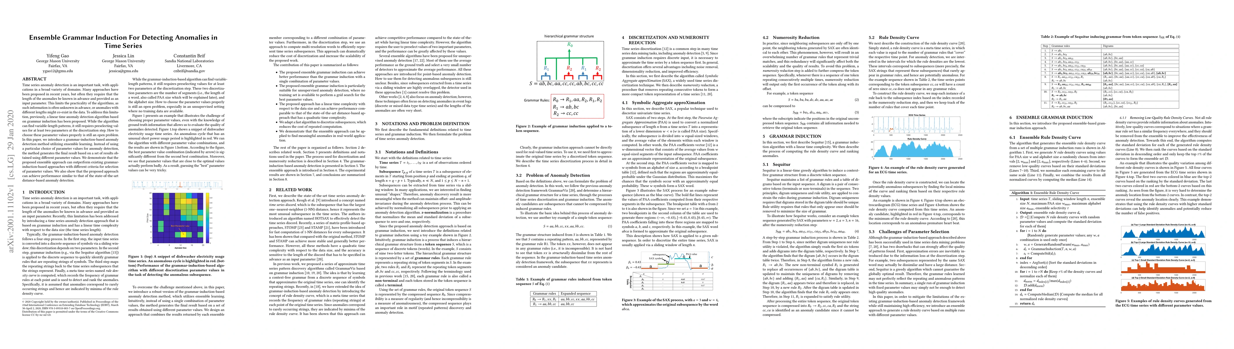 This paper proposes an ensemble learning approach to anomaly detection in time series data using grammar induction, aiming to overcome the limitations of existing methods that require predefined anomaly lengths and parameter values. The ensemble method aggregates results from multiple parameter-value configurations, demonstrating improved performance over single-parameter approaches and comparable results to state-of-the-art distance-based algorithms.