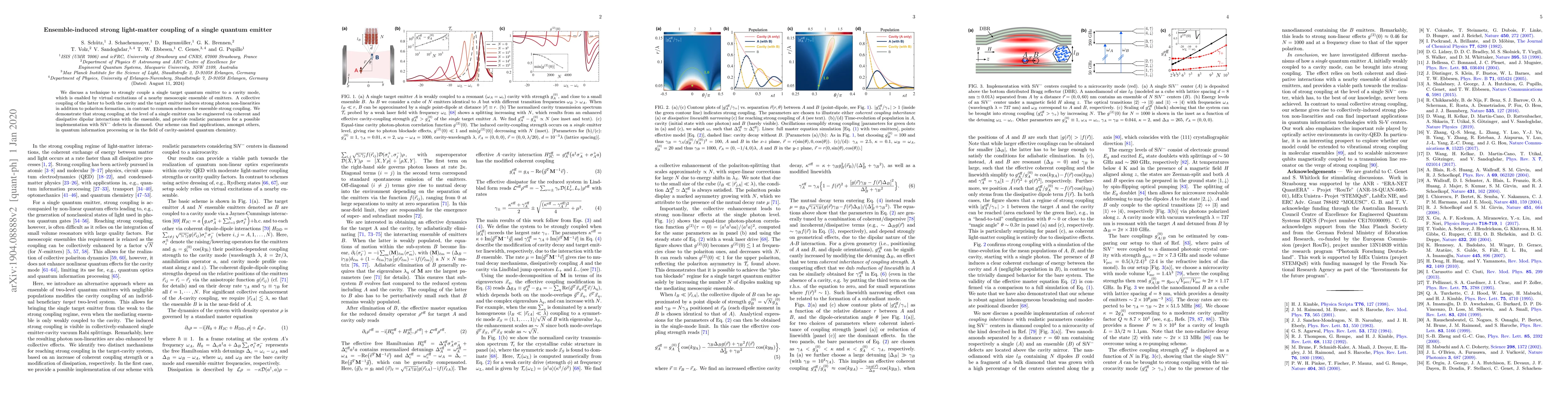 This paper presents a novel technique to strongly couple a single quantum emitter to a cavity mode using virtual excitations of a nearby mesoscopic ensemble, leading to enhanced photon non-linearities and polariton formation. The method leverages coherent and dissipative interactions, with potential applications in quantum information processing and cavity-assisted quantum chemistry.