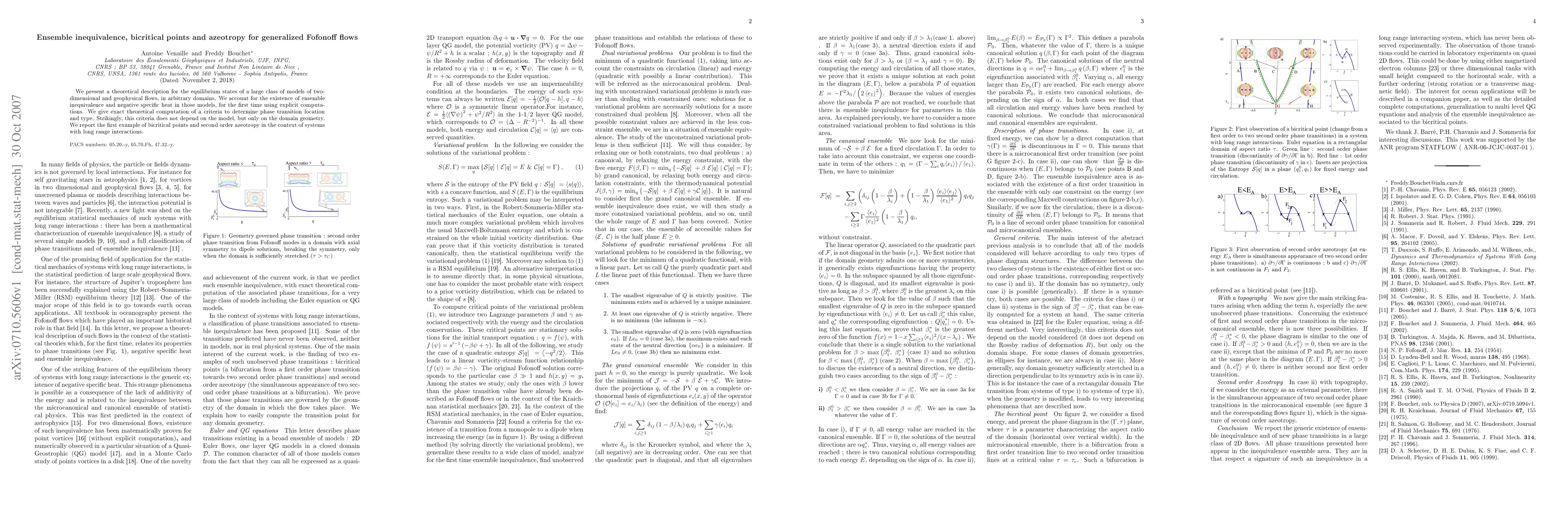 This paper provides a theoretical framework for analyzing equilibrium states in generalized Fofonoff flows, revealing ensemble inequivalence and negative specific heat. It introduces a domain-geometry-dependent criterion for phase transitions, and reports the first instances of bicritical points and second-order azeotropy in systems with long-range interactions.