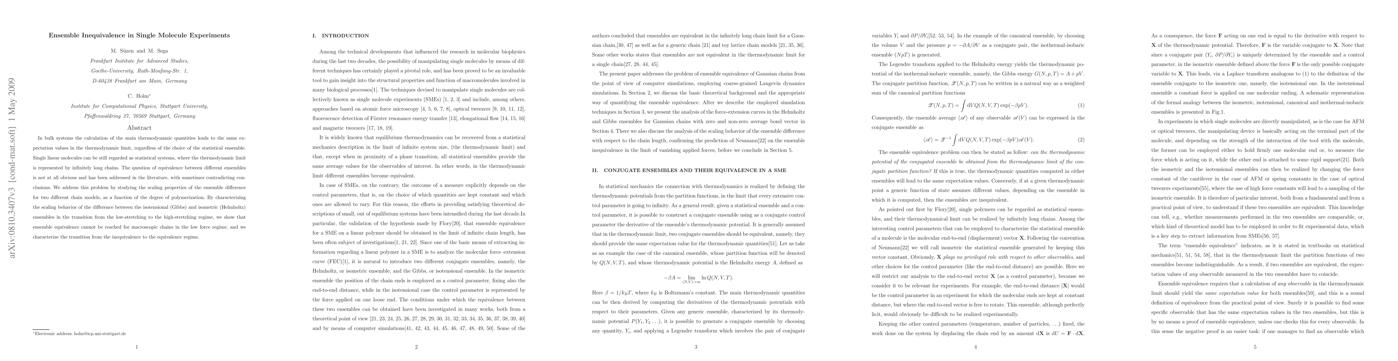 This paper investigates the ensemble equivalence in thermodynamic calculations for single linear molecules, demonstrating that ensemble differences persist in macroscopic chains under low force conditions. It characterizes the transition from inequivalence to equivalence by analyzing the scaling behavior of ensemble differences in two chain models.