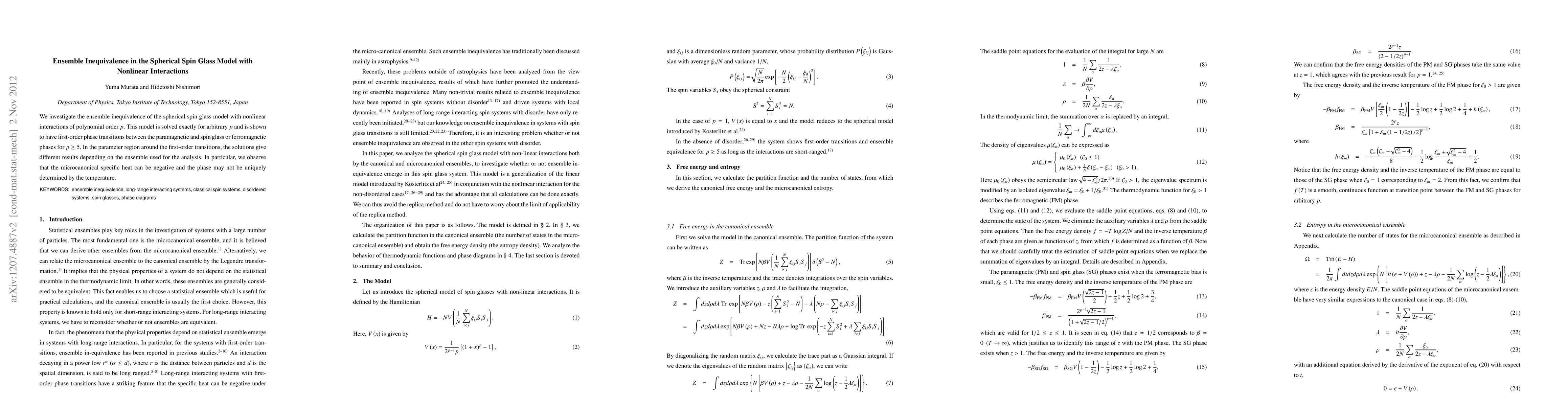 This paper examines the spherical spin glass model with nonlinear polynomial interactions, solving it exactly and identifying first-order phase transitions for $p \geq 5$. It reveals ensemble inequivalence, showing differing results based on the analysis ensemble, with negative microcanonical specific heat and non-unique phase determination near transitions.