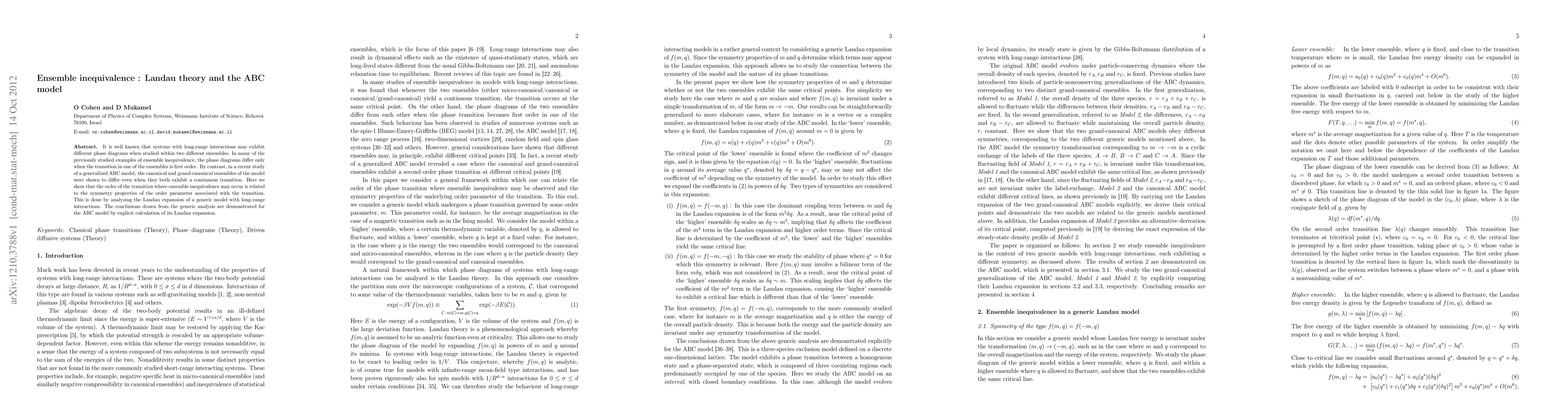 This paper investigates ensemble inequivalence in systems with long-range interactions, showing that even continuous transitions can differ between canonical and grand-canonical ensembles. It links the order of such transitions to the symmetry properties of the order parameter, demonstrated through a Landau expansion analysis and applied to the generalized ABC model.