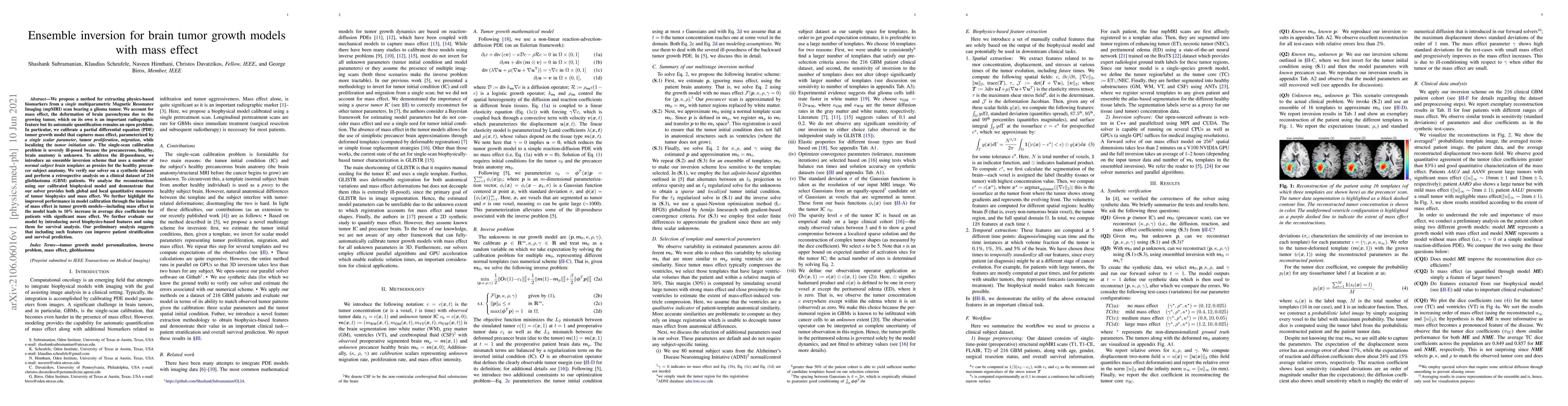 We propose a method for extracting physics-based biomarkers from a single multiparametric Magnetic Resonance Imaging (mpMRI) scan bearing a glioma tumor. We account for mass effect, the deformation of brain parenchyma due to the growing tumor, which on its own is an important radiographic feature but its automatic quantification remains an open problem. In particular, we calibrate a partial differential equation (PDE) tumor growth model that captures mass effect, parameterized by a single scalar parameter, tumor proliferation, migration, while localizing the tumor initiation site. The single-scan calibration problem is severely ill-posed because the precancerous, healthy, brain anatomy is unknown. To address the ill-posedness, we introduce an ensemble inversion scheme that uses a number of normal subject brain templates as proxies for the healthy precancer subject anatomy. We verify our solver on a synthetic dataset and perform a retrospective analysis on a clinical dataset of 216 glioblastoma (GBM) patients. We analyze the reconstructions using our calibrated biophysical model and demonstrate that our solver provides both global and local quantitative measures of tumor biophysics and mass effect. We further highlight the improved performance in model calibration through the inclusion of mass effect in tumor growth models -- including mass effect in the model leads to 10% increase in average dice coefficients for patients with significant mass effect. We further evaluate our model by introducing novel biophysics-based features and using them for survival analysis. Our preliminary analysis suggests that including such features can improve patient stratification and survival prediction.