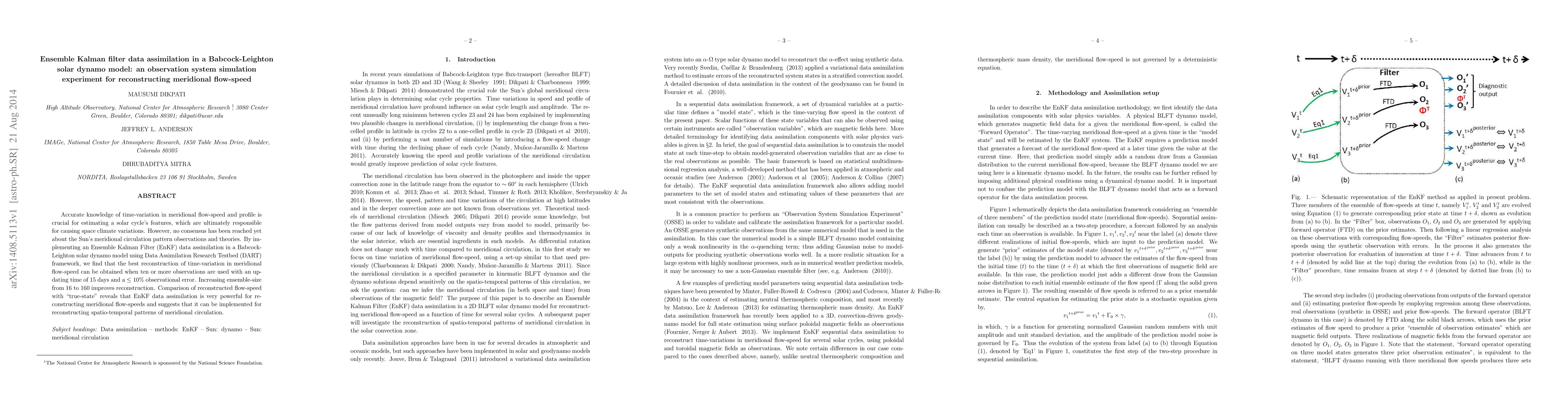 Researchers used Ensemble Kalman Filter data assimilation in a solar dynamo model to reconstruct meridional flow-speed with high accuracy, finding that larger ensemble sizes improved results.