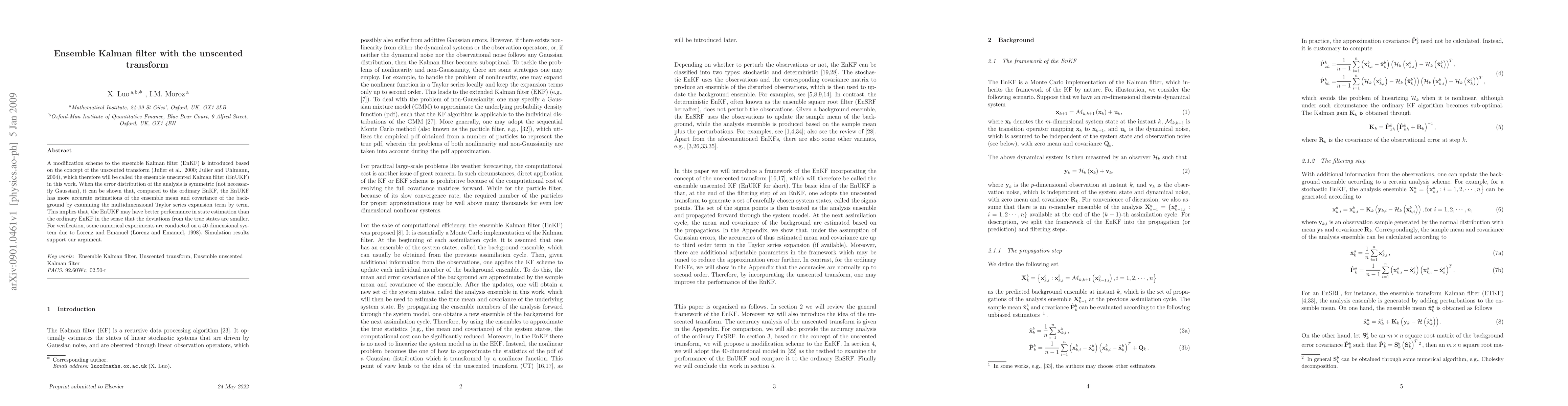 This paper introduces the ensemble unscented Kalman filter (EnUKF), a modification of the ensemble Kalman filter using the unscented transform, which provides more accurate estimations of the ensemble mean and covariance compared to the ordinary ensemble Kalman filter. Numerical experiments on a 40-dimensional Lorenz system demonstrate the improved performance of the EnUKF.