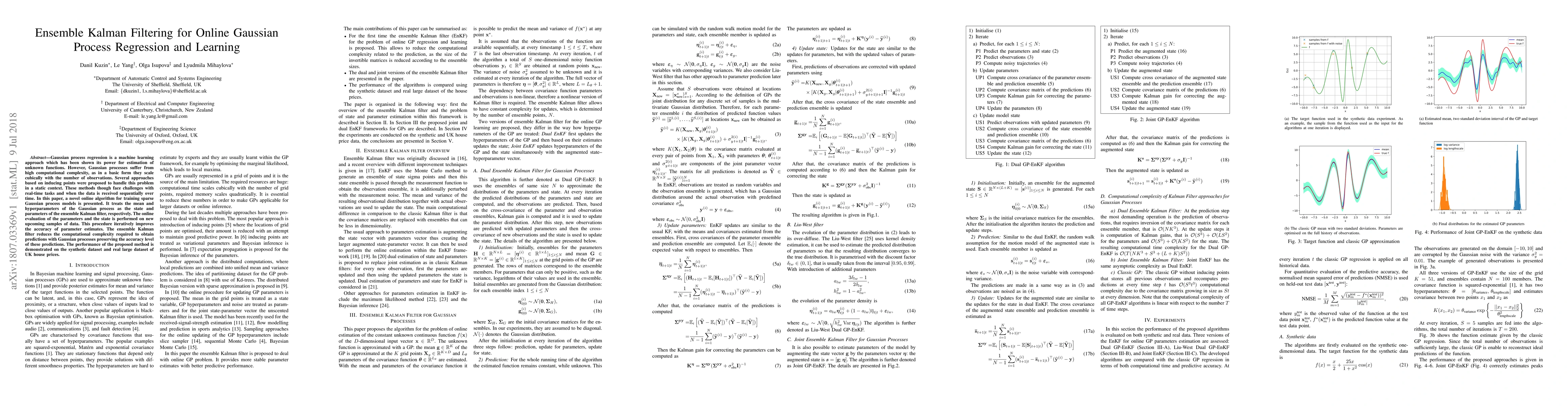 This paper presents an online algorithm using ensemble Kalman filtering to efficiently train sparse Gaussian process models for real-time tasks. The method reduces computational complexity while preserving prediction accuracy, demonstrated on synthetic and real-world datasets.