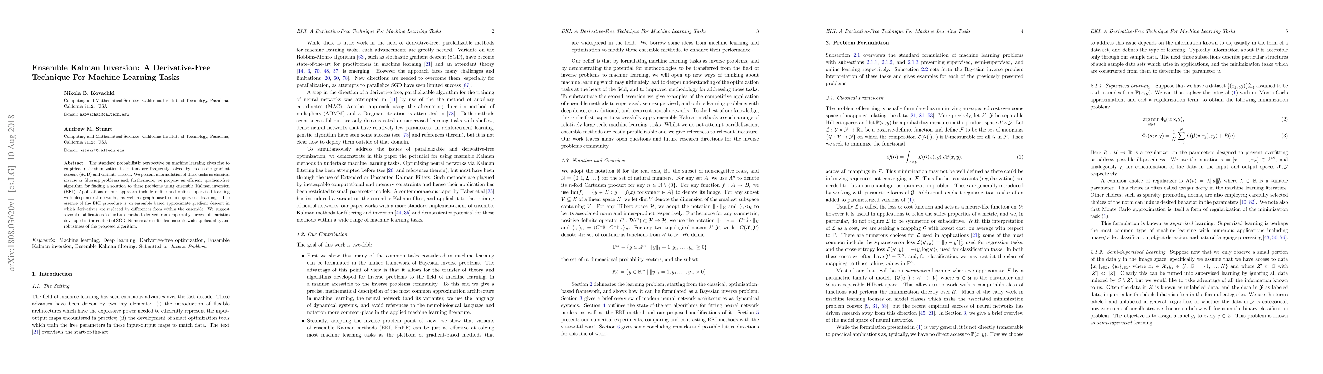 This paper introduces ensemble Kalman inversion (EKI), a derivative-free technique for machine learning tasks, replacing traditional gradient-based methods like SGD. It demonstrates EKI's effectiveness in offline and online supervised learning, deep neural networks, and semi-supervised learning through numerical results.