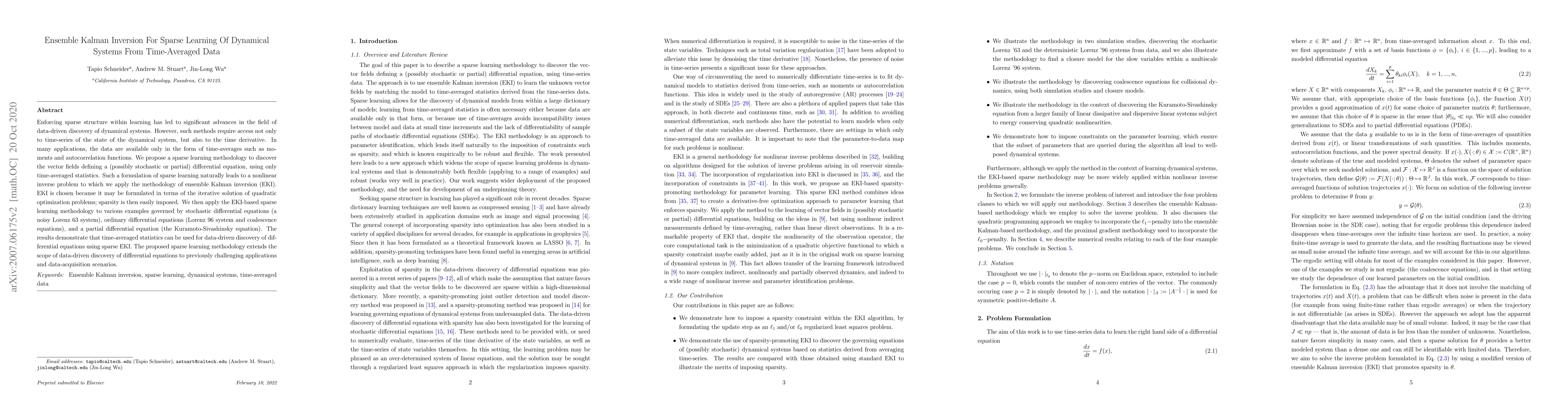 This paper proposes a sparse learning methodology using ensemble Kalman inversion (EKI) to discover vector fields of dynamical systems from time-averaged data, demonstrating its application to various stochastic and ordinary differential equations. The approach extends the scope of data-driven discovery to scenarios where only time-averages are available.