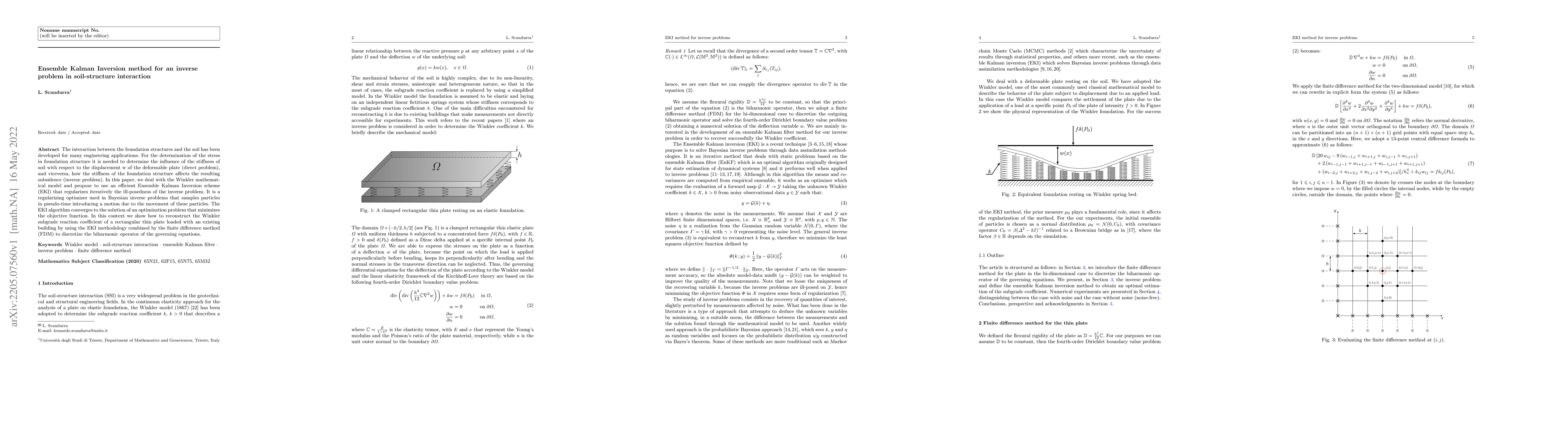 This paper proposes using the Ensemble Kalman Inversion (EKI) method to solve the inverse problem in soil-structure interaction, focusing on determining the Winkler subgrade reaction coefficient. The EKI algorithm iteratively regularizes the ill-posed inverse problem and combines with the finite difference method to discretize the governing equations.