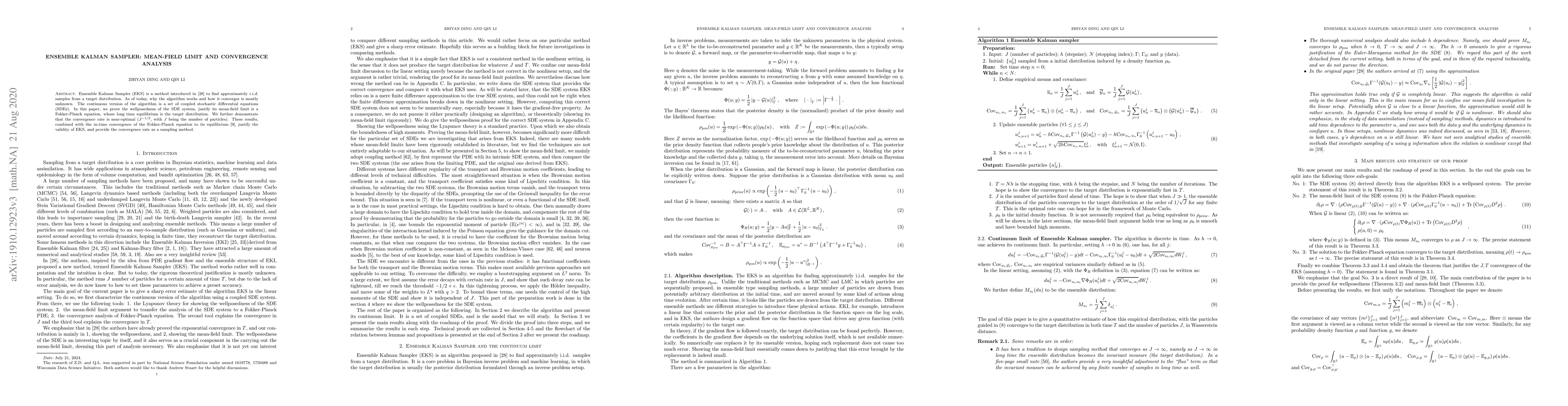 This paper proves the wellposedness of the Ensemble Kalman Sampler's continuous version as a set of coupled stochastic differential equations and justifies its mean-field limit as a Fokker-Planck equation. It demonstrates near-optimal convergence rate ($J^{-1/2}$), establishing the validity of EKS as a sampling method.