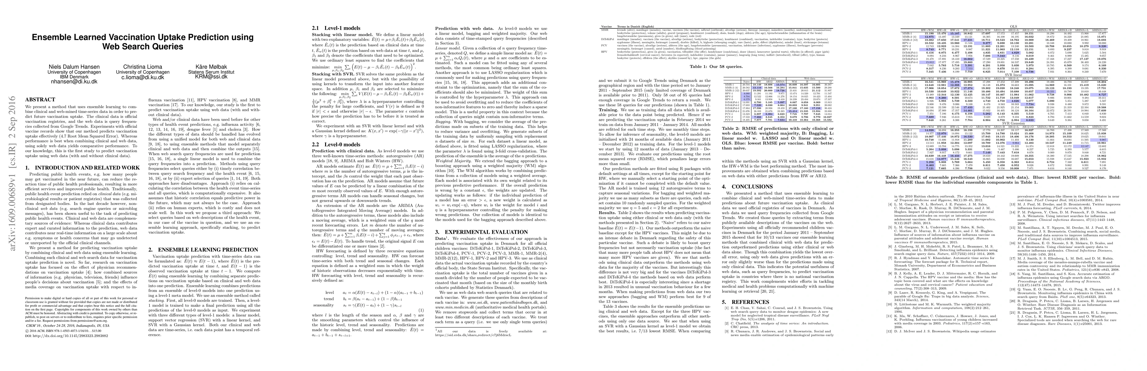 We present a method that uses ensemble learning to combine clinical and web-mined time-series data in order to predict future vaccination uptake. The clinical data is official vaccination registries, and the web data is query frequencies collected from Google Trends. Experiments with official vaccine records show that our method predicts vaccination uptake effectively (4.7 Root Mean Squared Error). Whereas performance is best when combining clinical and web data, using solely web data yields comparative performance. To our knowledge, this is the first study to predict vaccination uptake using web data (with and without clinical data).