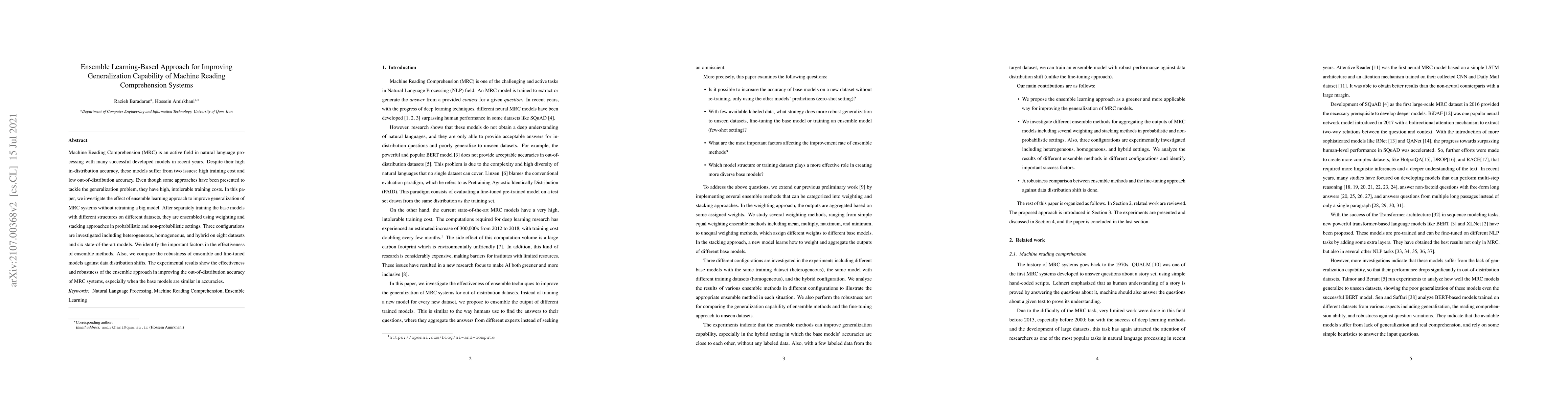 This paper proposes an ensemble learning approach to improve machine reading comprehension systems' generalization capability without retraining a big model. Experimental results show the effectiveness of the approach in improving out-of-distribution accuracy, especially when base models have similar accuracies.