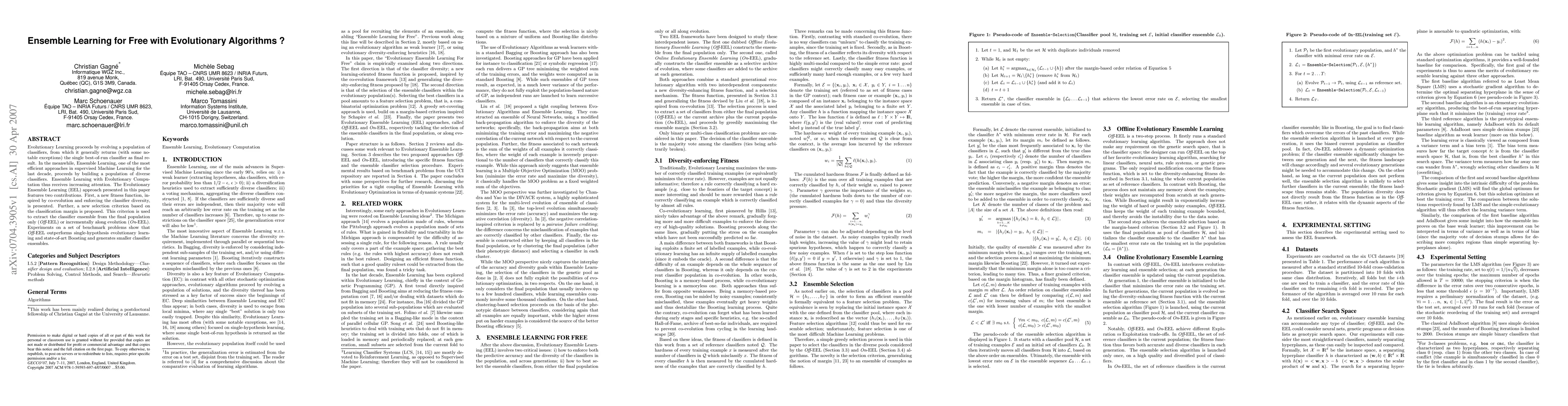 Evolutionary Ensemble Learning outperforms single-hypothesis evolutionary learning and state-of-the-art Boosting in generating smaller classifier ensembles with improved classification accuracy.