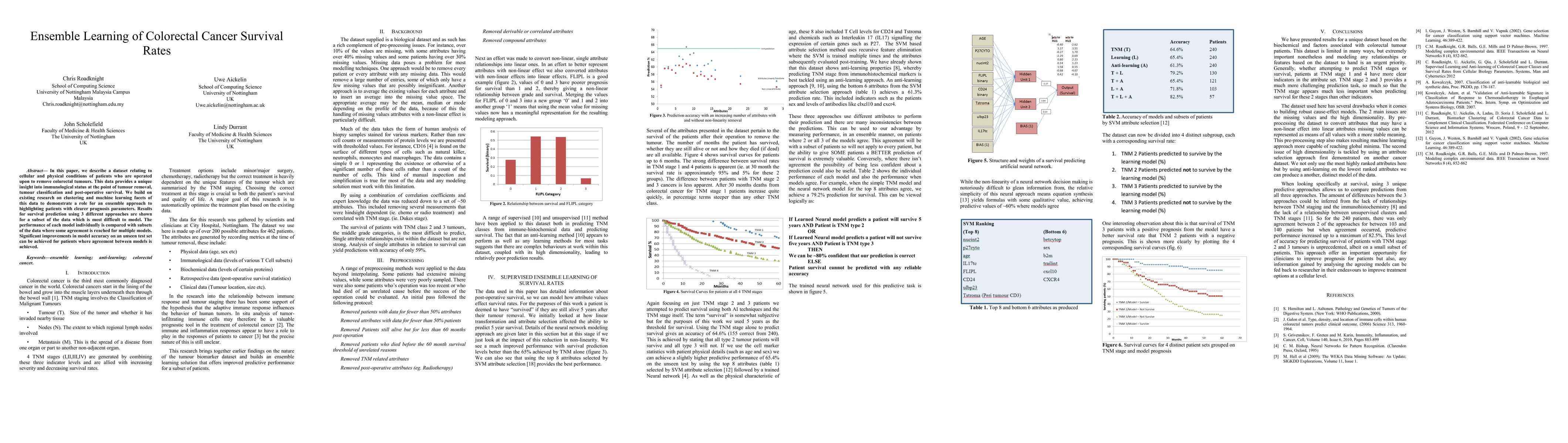 In this paper, we describe a dataset relating to cellular and physical conditions of patients who are operated upon to remove colorectal tumours. This data provides a unique insight into immunological status at the point of tumour removal, tumour classification and post-operative survival. We build on existing research on clustering and machine learning facets of this data to demonstrate a role for an ensemble approach to highlighting patients with clearer prognosis parameters. Results for survival prediction using 3 different approaches are shown for a subset of the data which is most difficult to model. The performance of each model individually is compared with subsets of the data where some agreement is reached for multiple models. Significant improvements in model accuracy on an unseen test set can be achieved for patients where agreement between models is achieved.