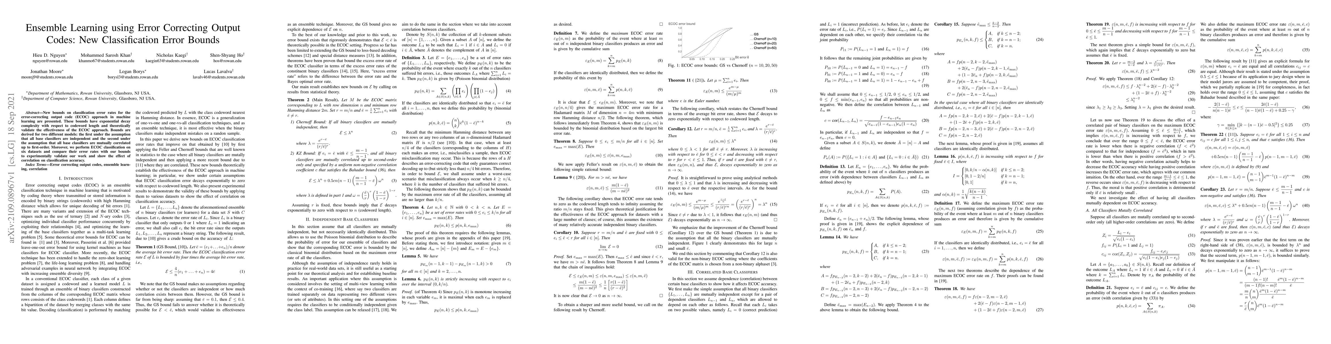 This paper presents new classification error bounds for the error-correcting output code (ECOC) approach in machine learning, showing exponential decay complexity with codeword length. It derives bounds for both independent and correlated base classifiers and validates the results experimentally on six datasets.