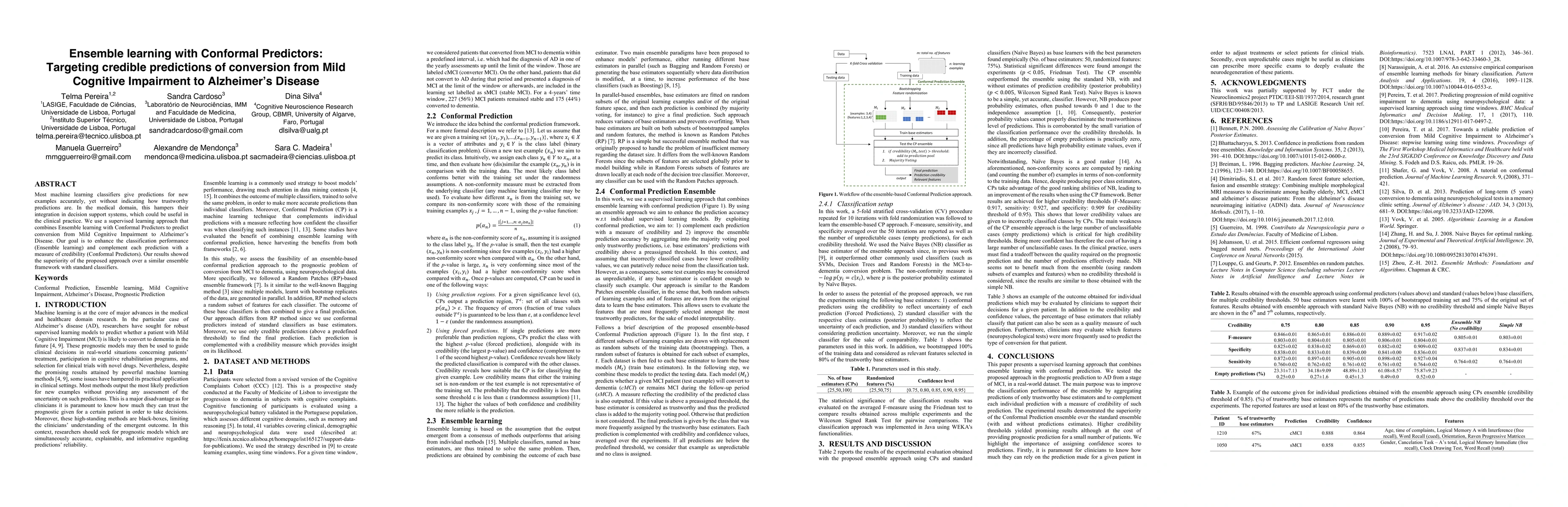 Most machine learning classifiers give predictions for new examples accurately, yet without indicating how trustworthy predictions are. In the medical domain, this hampers their integration in decision support systems, which could be useful in the clinical practice. We use a supervised learning approach that combines Ensemble learning with Conformal Predictors to predict conversion from Mild Cognitive Impairment to Alzheimer's Disease. Our goal is to enhance the classification performance (Ensemble learning) and complement each prediction with a measure of credibility (Conformal Predictors). Our results showed the superiority of the proposed approach over a similar ensemble framework with standard classifiers.