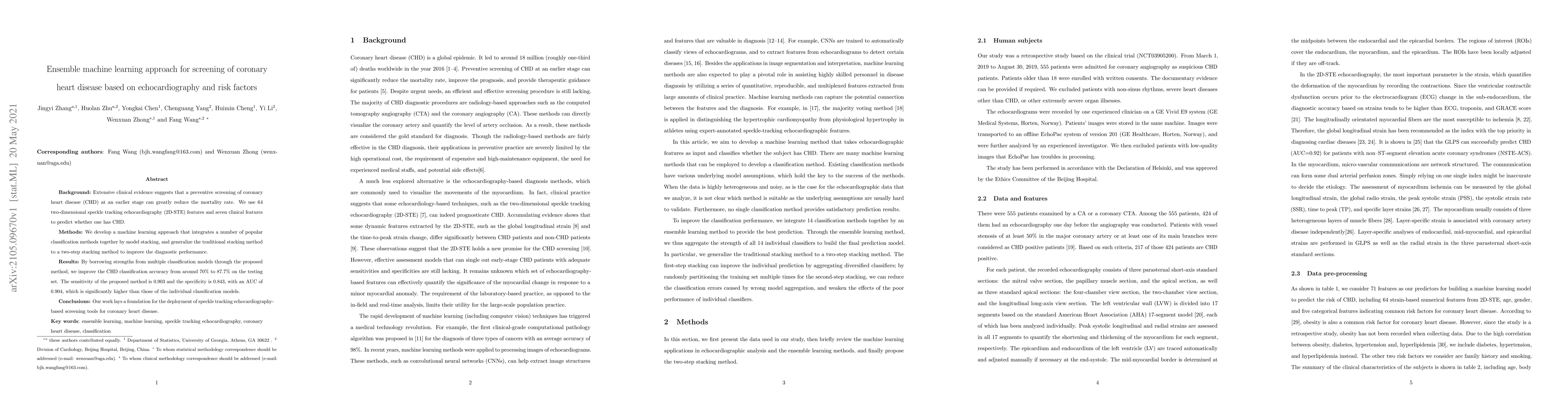 This paper proposes an ensemble machine learning approach combining multiple classification methods to improve the screening of coronary heart disease using echocardiography and risk factors. The two-step stacking method enhances diagnostic accuracy, raising classification accuracy from 70% to 87.7%, with notable sensitivity and specificity improvements.