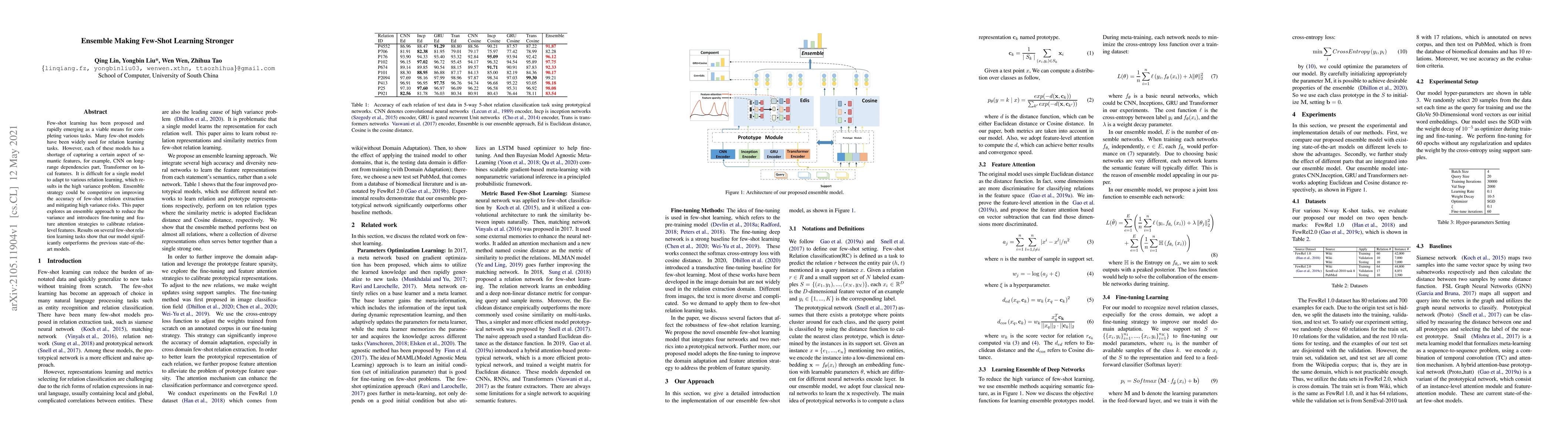 Few-shot learning has been proposed and rapidly emerging as a viable means for completing various tasks. Many few-shot models have been widely used for relation learning tasks. However, each of these models has a shortage of capturing a certain aspect of semantic features, for example, CNN on long-range dependencies part, Transformer on local features. It is difficult for a single model to adapt to various relation learning, which results in the high variance problem. Ensemble strategy could be competitive on improving the accuracy of few-shot relation extraction and mitigating high variance risks. This paper explores an ensemble approach to reduce the variance and introduces fine-tuning and feature attention strategies to calibrate relation-level features. Results on several few-shot relation learning tasks show that our model significantly outperforms the previous state-of-the-art models.