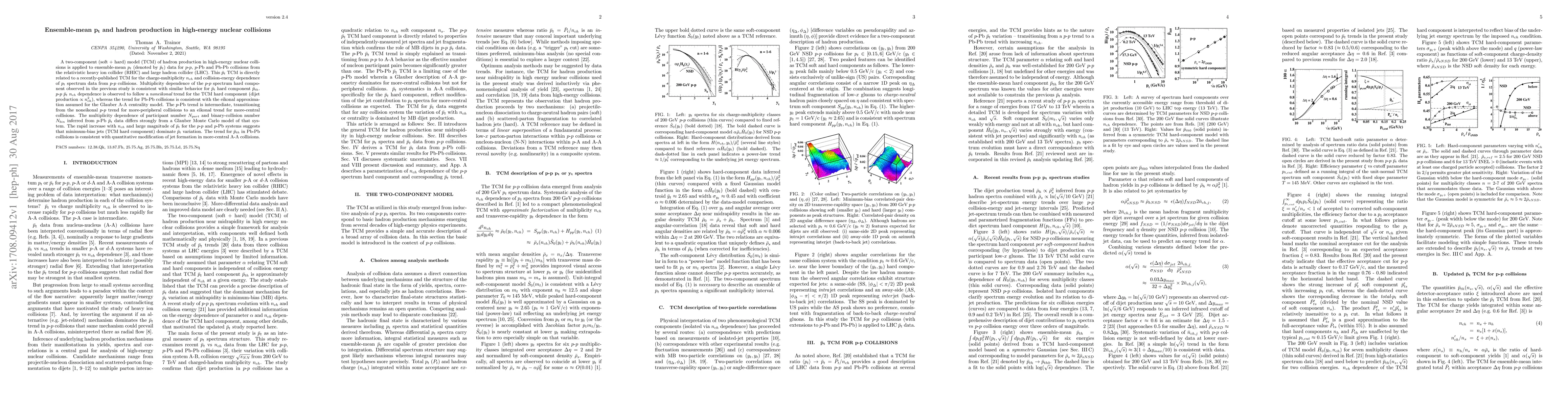 A two-component (soft + hard) model (TCM) of hadron production in high-energy nuclear collisions is applied to ensemble-mean $p_t$ (denoted by $\bar p_t$) data for $p$-$p$, $p$-Pb and Pb-Pb collisions from the relativistic heavy ion collider (RHIC) and large hadron collider (LHC). This $\bar p_t$ TCM is directly related to a recently-published TCM for the charge-multiplicity $n_{ch}$ and collision-energy dependence of $p_t$ spectrum data from $p$-$p$ collisions. Multiplicity dependence of the $p$-$p$ spectrum hard component observed in the previous study is consistent with similar behavior for $\bar p_t$ hard component $\bar p_{th}$. $p$-$p$ $\bar p_t$ $n_{ch}$ dependence is observed to follow a noneikonal trend for the TCM hard component (dijet production $\propto n_{ch}^2$), whereas the trend for Pb-Pb collisions is consistent with the eikonal approximation assumed for the Glauber A-A centrality model. The $p$-Pb trend is intermediate, transitioning from the noneikonal $p$-$p$ trend for more-peripheral collisions to an eikonal trend for more-central collisions. The multiplicity dependence of participant number $N_{part}$ and binary-collision number $N_{bin}$ inferred from $p$-Pb $\bar p_t$ data differs strongly from a Glauber Monte Carlo model of that system. The rapid increase with $n_{ch}$ and large magnitude of $\bar p_t$ for the $p$-$p$ and $p$-Pb systems suggests that minimum-bias jets (TCM hard component) dominate $\bar p_t$ variation. The trend for $\bar p_{th}$ in Pb-Pb collisions is consistent with quantitative modification of jet formation in more-central A-A collisions.