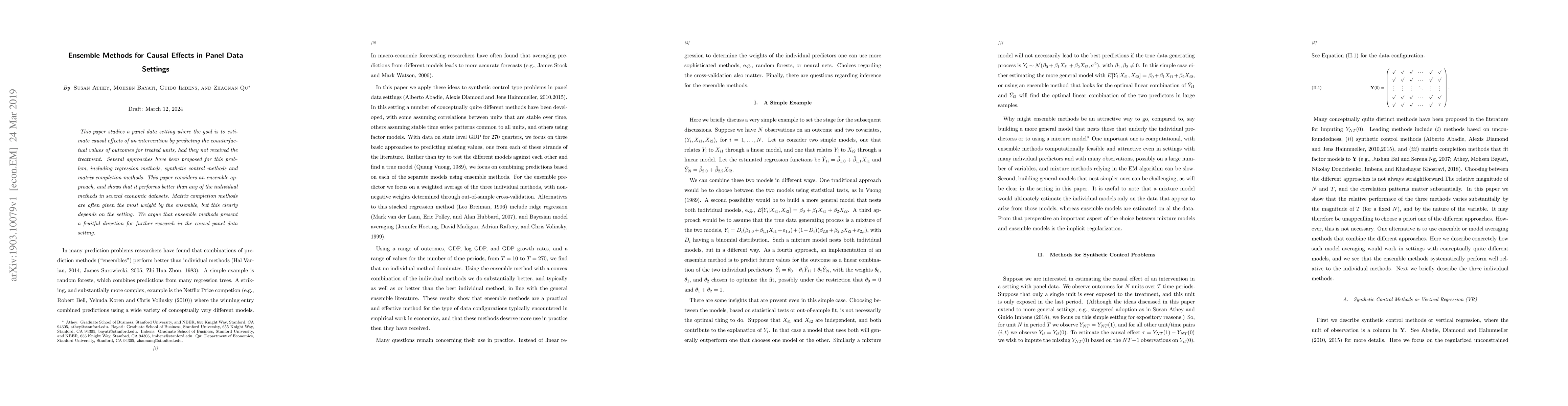 This paper investigates ensemble methods for estimating causal effects in panel data, demonstrating superior performance over individual methods like regression and synthetic control. It highlights that matrix completion often dominates the ensemble but emphasizes the need for further research in this promising direction.